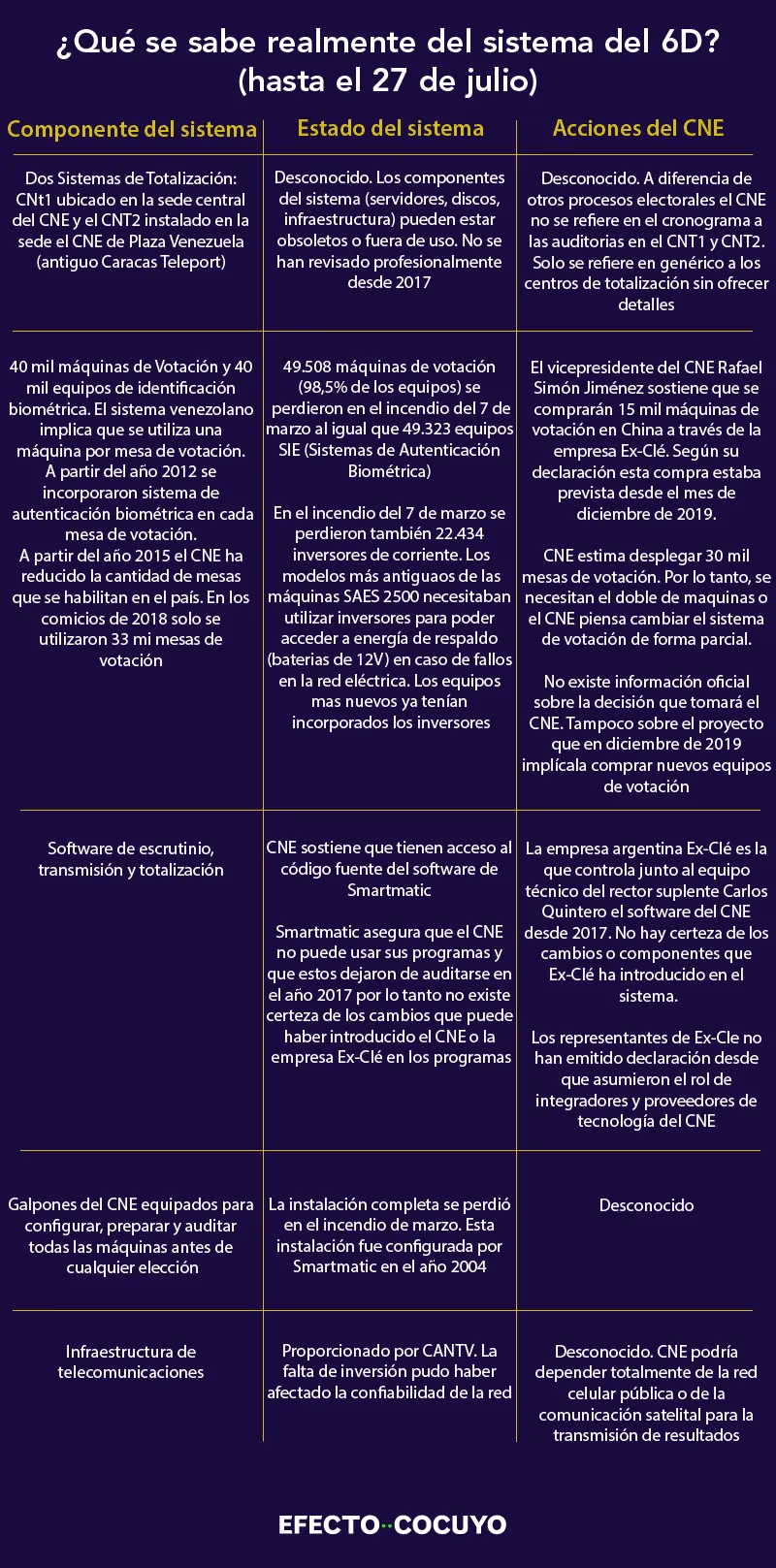 Sin embargo, los técnicos de la dirección de informática y automatización del CNE consultados por la Unidad de Verificación de Datos y Fact-Checking de Efecto Cocuyo argumentan que, aunque Smartmatic ya no está en Venezuela, el organismo sigue manteniendo el control sobre software de la empresa. Según estos técnicos (no autorizados a declarar) el CNE solo debe limitarse a instalar los programas en los nuevos equipos de votación.