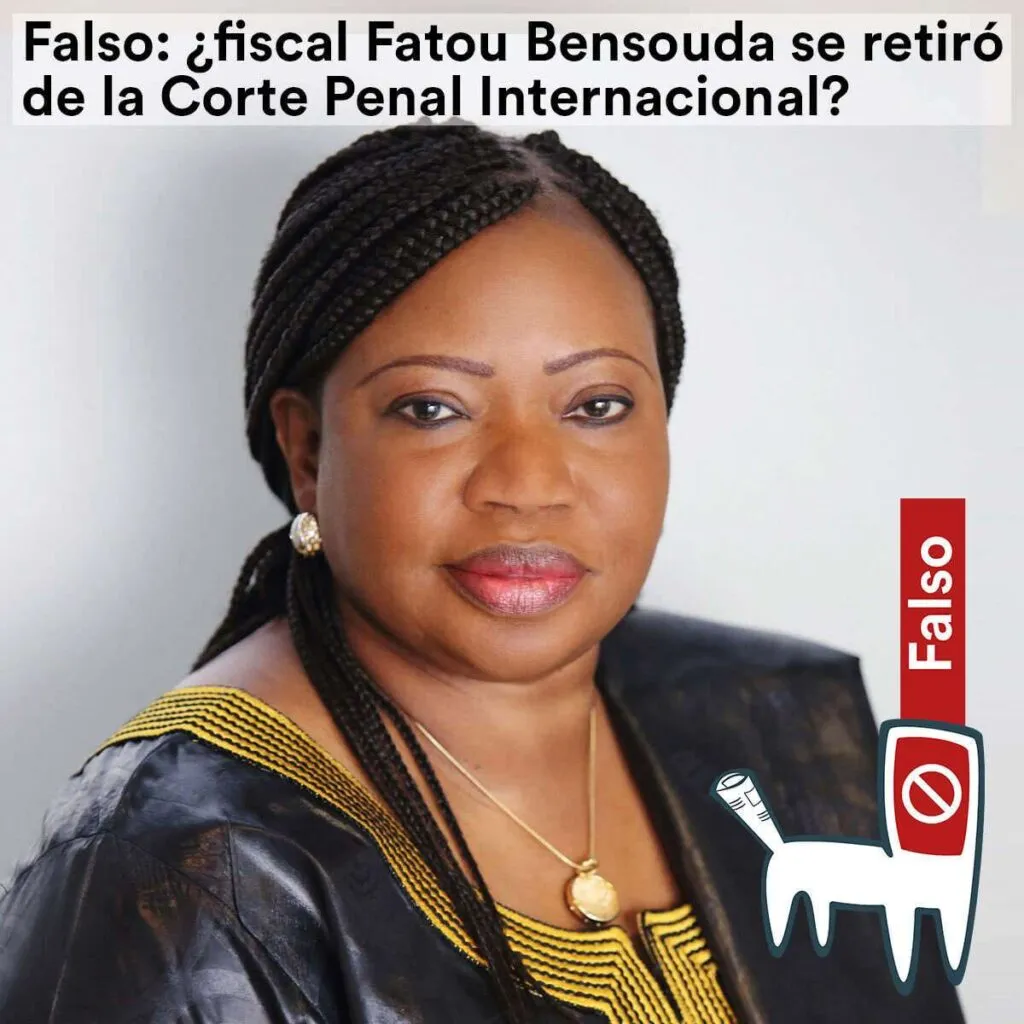 La investigación de Cazadores de Fake News determinó que la información es FALSA. Según la página oficial de la Corte Penal Internacional, la fiscal permanecerá en el cargo hasta junio del año 2021. No existe en la mencionada página oficial, ningún comunicado, información o declaración que indique que la fiscal Bensouda se retirará de su cargo en el corto plazo.