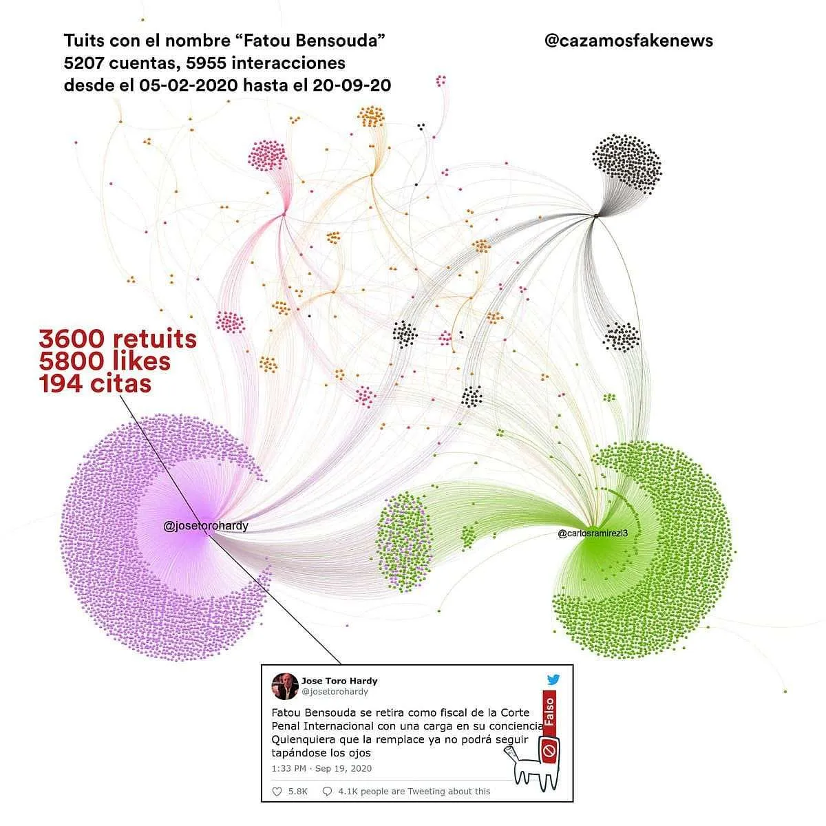 Realizamos scraping en la red social, descargando tuits recientes con el nombre «Fatou Bensouda». La publicación más relevante y compartida fue un tuit publicado por el economista venezolano José Toro Hardy. El contenido de este tuit fue malinterpretado por usuarios de la red social, dando inicio al rumor:
