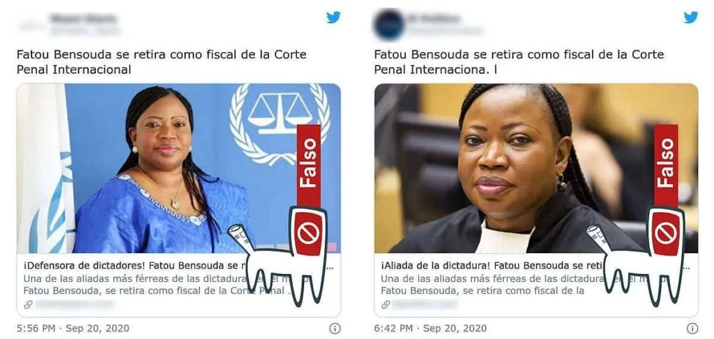 Una FALSA información sobre el retiro o la renuncia de la fiscal Fatou Bensouda de la Corte Penal Internacional, fue difundida desde el 20 de septiembre de 2020 en redes sociales, mensajería instantánea y algunos portales digitales de noticias.