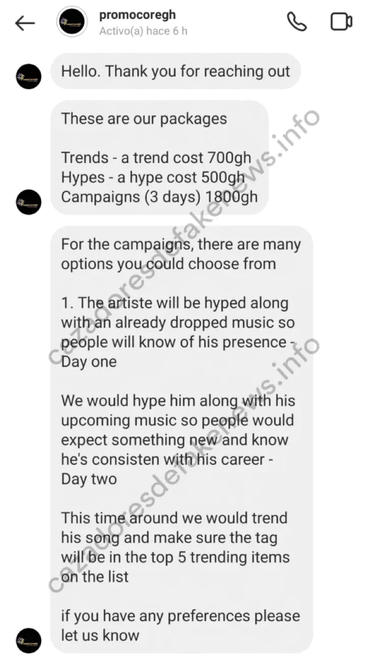 Para conocer el costo aproximado de las campañas en Twitter impulsadas por PromoCoreGH, realizamos una consulta vía mensaje directo en Instagram, solicitando información para una compañía discográfica (no existente) interesada en impulsar artistas musicales que forman parte de su catálogo.