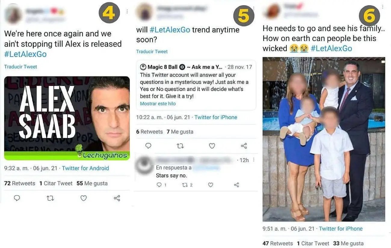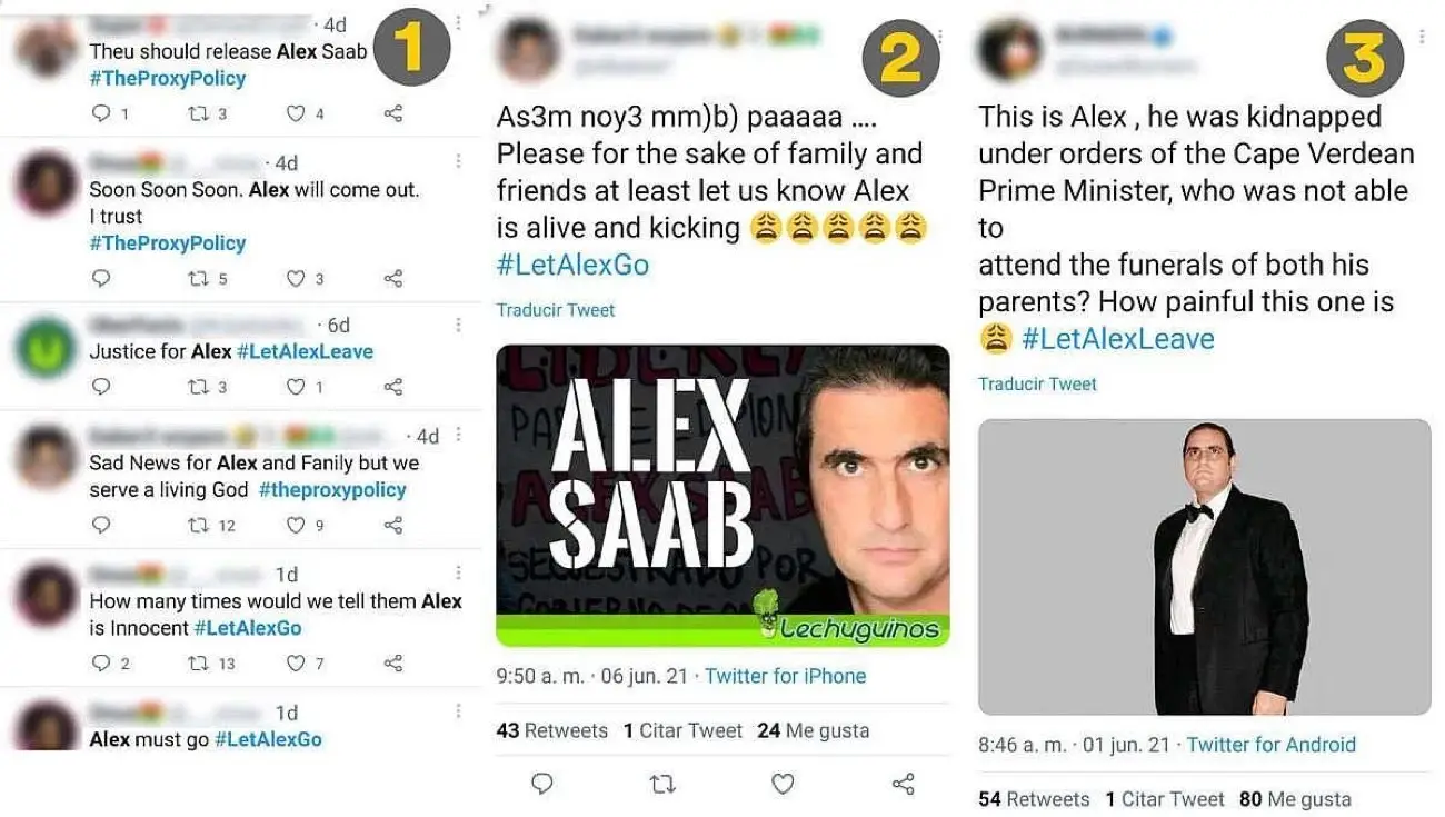 Los tweets que forman parte de esta campaña tienen una característica muy particular: no dejan explícito que se refieren a Alex Saab en las etiquetas ni en la mayoría de los tweets. Estos últimos, por ejemplo, contienen información y fotografías sobre Alex Saab, pero se refieren a él simplemente como «Alex«, omitiendo escribir su apellido. Varias de las cuentas que impulsan estas tendencias pertenecen a influencers reales y poseen varios miles de seguidores con los que interactúan diaria y orgánicamente. Por ello, sus dueños cuidan a sus cuentas de eventuales bloqueos o sanciones similares a las aplicadas a los influencers nigerianos del caso Alpha Reach, evitando mencionar directamente el nombre «Alex Saab«.