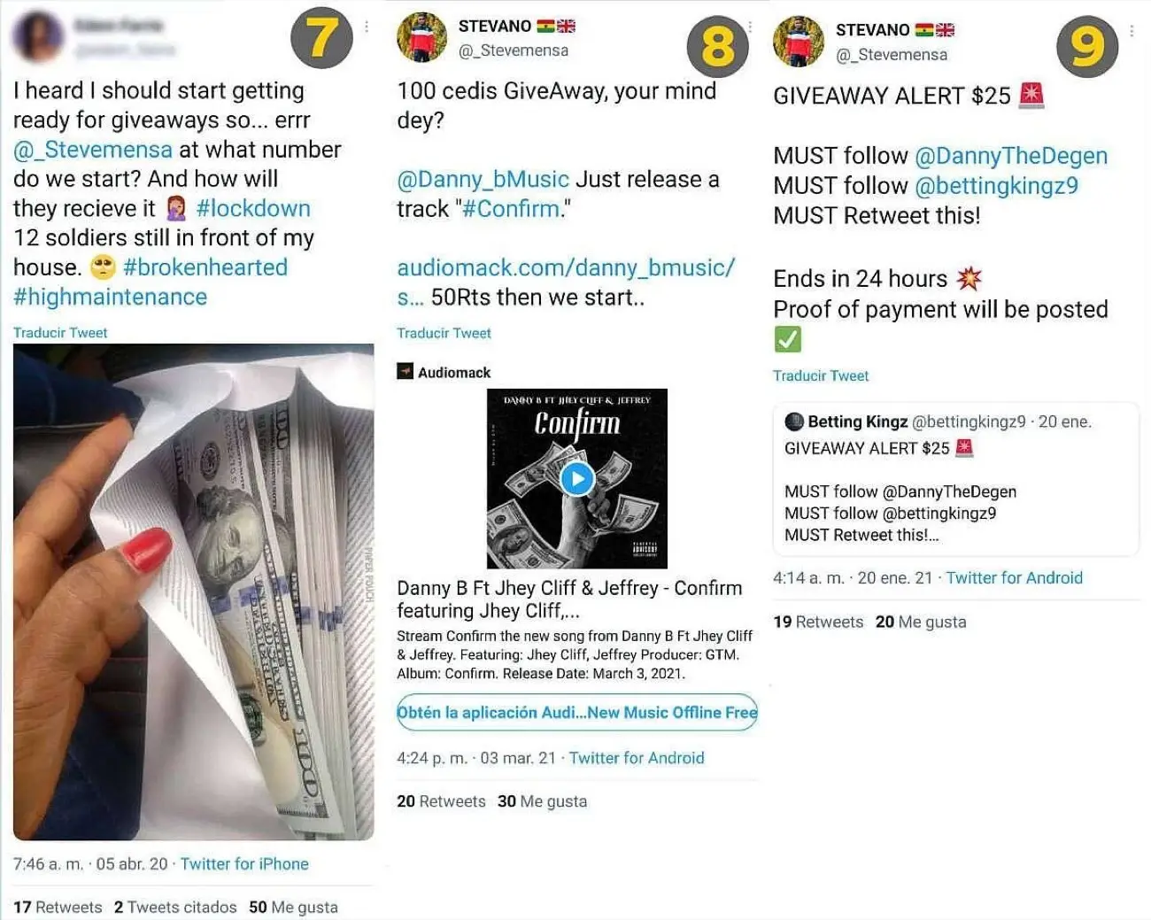 Una de las cuentas que posee mayor centralidad (relevancia) en el clúster verde es @_stevemensa, quien es un tuitero de Ghana conocido por realizar rifas («giveaways») para impulsar tendencias publicitarias sobre lanzamientos musicales de artistas locales, influencers, restaurantes, entre otros: