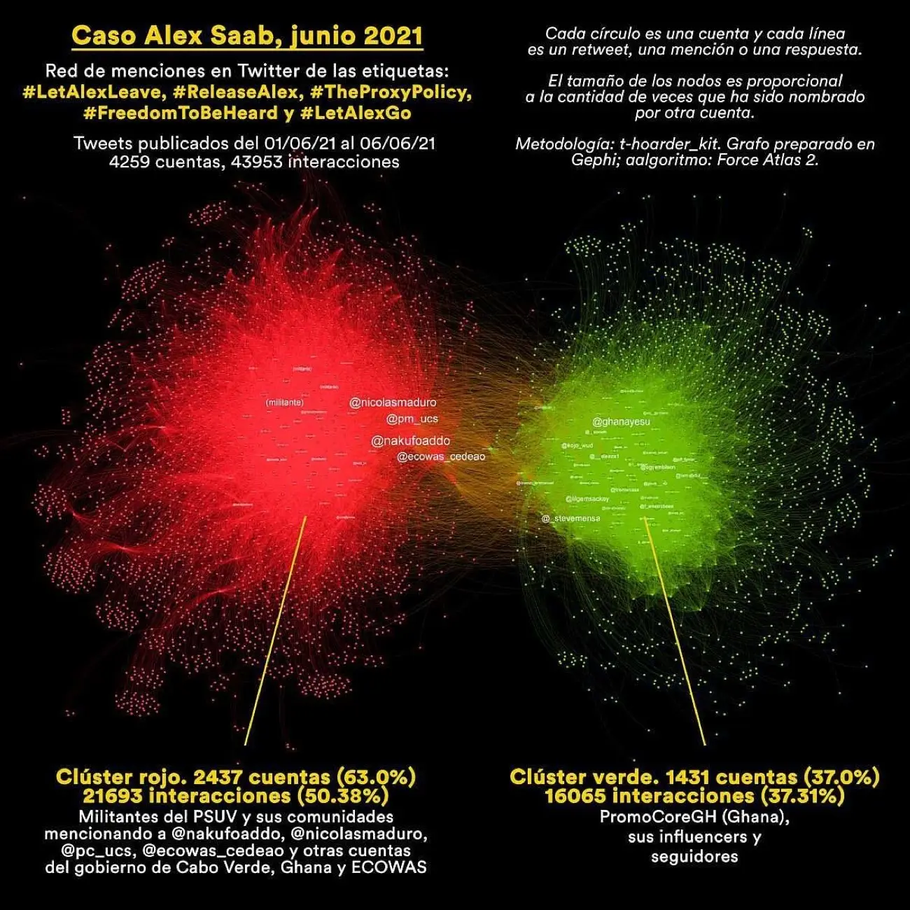 Realizamos la descarga y el análisis de 104.742 tweets que incluyen etiquetas con tendencias relacionadas a Alex Saab, impulsadas en Ghana desde el 1° de junio al 6 de junio de 2021 y determinamos sus características. La campaña está siendo liderada por un grupo de influencers y pretende mostrarse como una protesta popular y espontánea, pero en realidad es una campaña de astroturfing, impulsada por una empresa de marketing digital de Ghana (un «laboratorio»), que brinda servicios de posicionamiento en redes sociales de forma totalmente pública. Esta actividad viola varias de las políticas en contra de la manipulación de plataforma de Twitter.