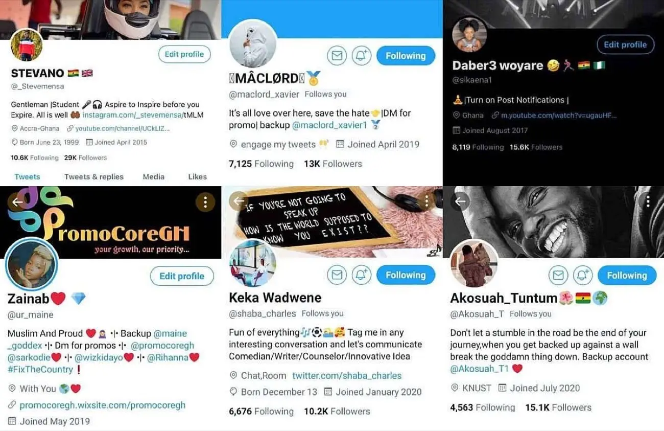 En su cuenta de Instagram, PromoCoreGH identifica explícitamente a los influencers de Twitter que están a su disposición para impulsar campañas contratadas por terceros. En una carpeta de sus historias en Instagram titulada «Our Influencers» («Nuestros influencers«), aparecen varios de las cuentas que participaron activamente en las campañas de influencia a favor de Alex Saab en Cabo Verde. Las seis cuentas mostradas abajo, aparecen en con las líneas resaltadas en amarillo en la tabla anterior. Dos de sus operadores manejan simultáneamente dos cuentas cada uno: