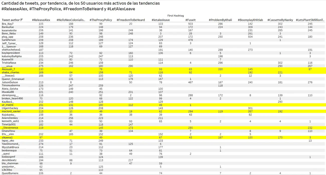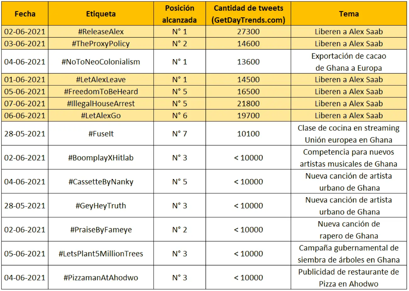 El 6 de junio de 2021 realizamos la descarga de seis tendencias que habían sido impulsadas por un grupo de cuentas en Ghana y que parecían ser parte de una nueva campaña coordinada a favor de Alex Saab impulsadas desde ese país: #LetAlexLeave (#DejenQueAlexSeVaya, 1° de junio), #ReleaseAlex (#LiberenAAlex, 2 de junio), #TheProxyPolicy (#LaPolíticaProxy, 3 de junio), #FreedomToBeHeard (#LibertadParaSerEscuchado, 5 de junio), #LetAlexGo (#DejenQueAlexSeVaya, 6 de junio) y #IllegalHouseArrest (#ArrestoDomiciliarioIlegal, el 7 de junio).