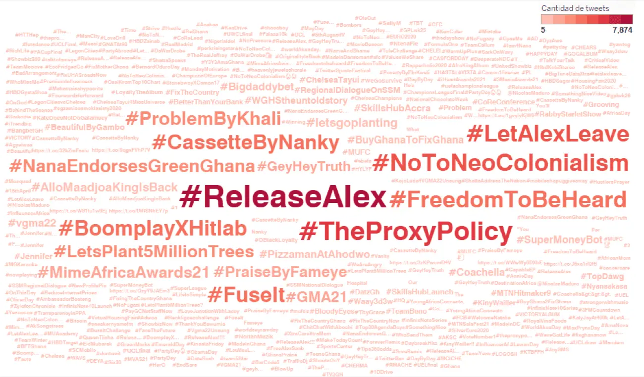 Entre esta nube de palabras surgen nombres de otras etiquetas intensamente impulsadas durante días anteriores, entre los que hallamos campañas publicitarias para artistas musicales de Ghana (#CassetteByNanky, PraiseByFameye, #BoomplayXHitlab), temas locales del país (#NoToNeoColonialism, #LetsPlant5MillionTrees) y una campaña publicitaria para una pizzería en Ahodwo, un suburbio de la ciudad de Kumasi, Ghana: