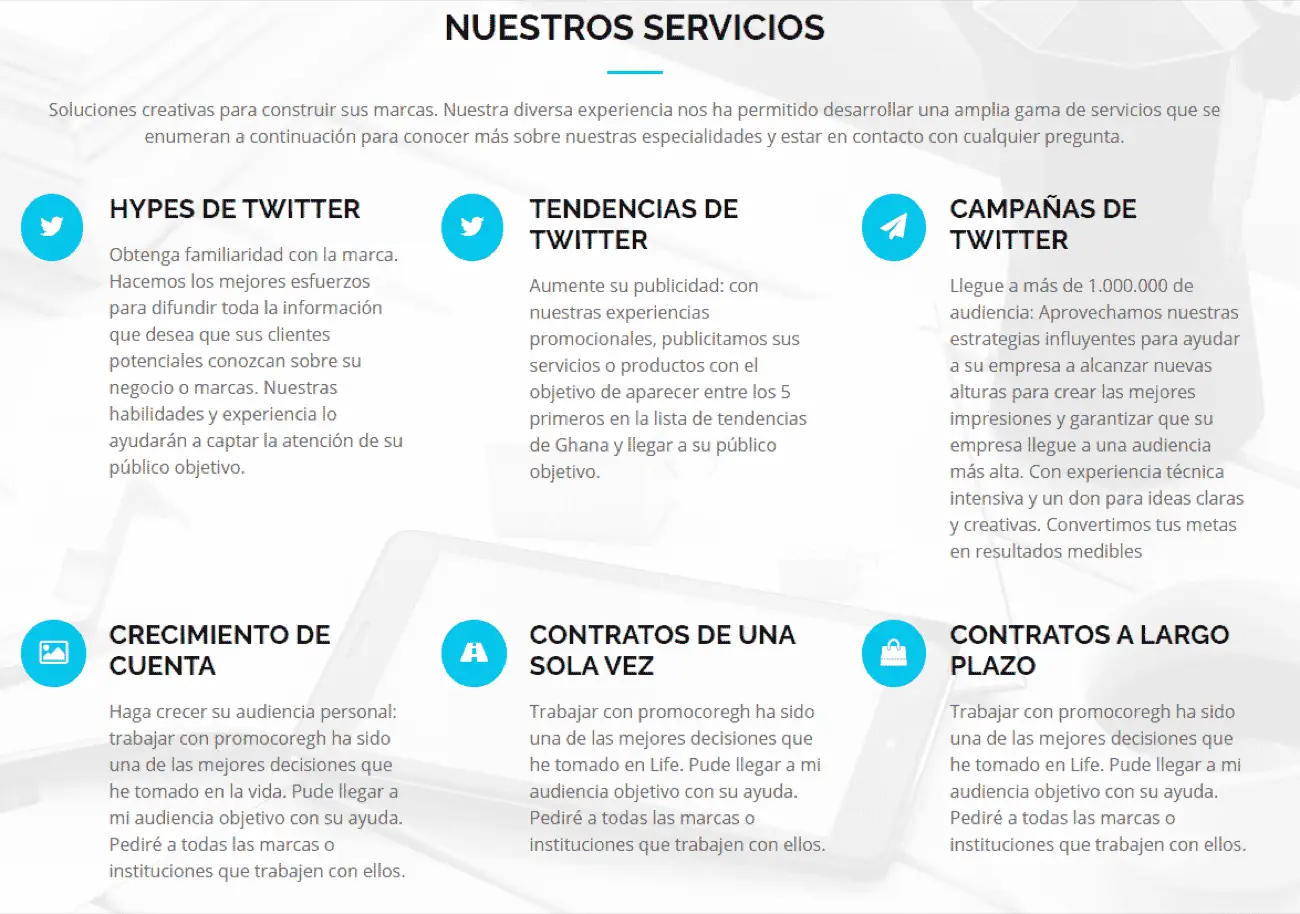 En su página web, PromoCoreGH es bastante explícita con el tipo de servicios que ofrece: «hypes» (publicidad) en Twitter, posicionamiento de tendencias y campañas en Twitter, con modalidades de contratos únicos o a largo plazo: