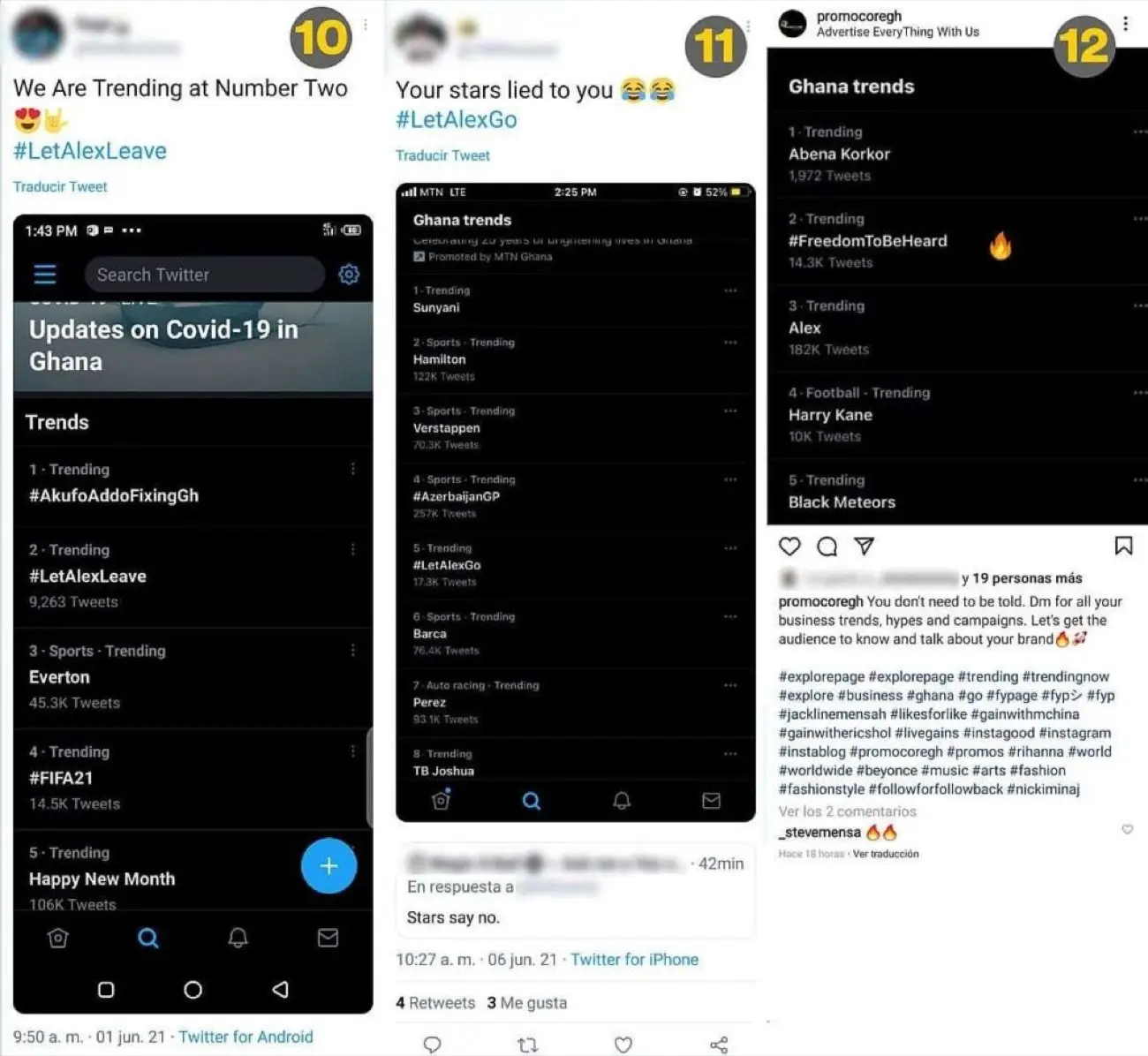 Hasta el día 8 de junio, observamos el posicionamiento de 7 tendencias (#LetAlexGo, #ReleaseAlex, #TheProxyPolicy, #FreedomToBeHeard, #IllegalHouseArrest, para un total de unos 600 USD por dos campañas de tres días cada uno (estímense 300 USD adicionales por cada tres días de campaña adicionales en los que se posicionen etiquetas en el top 5 de Ghana).