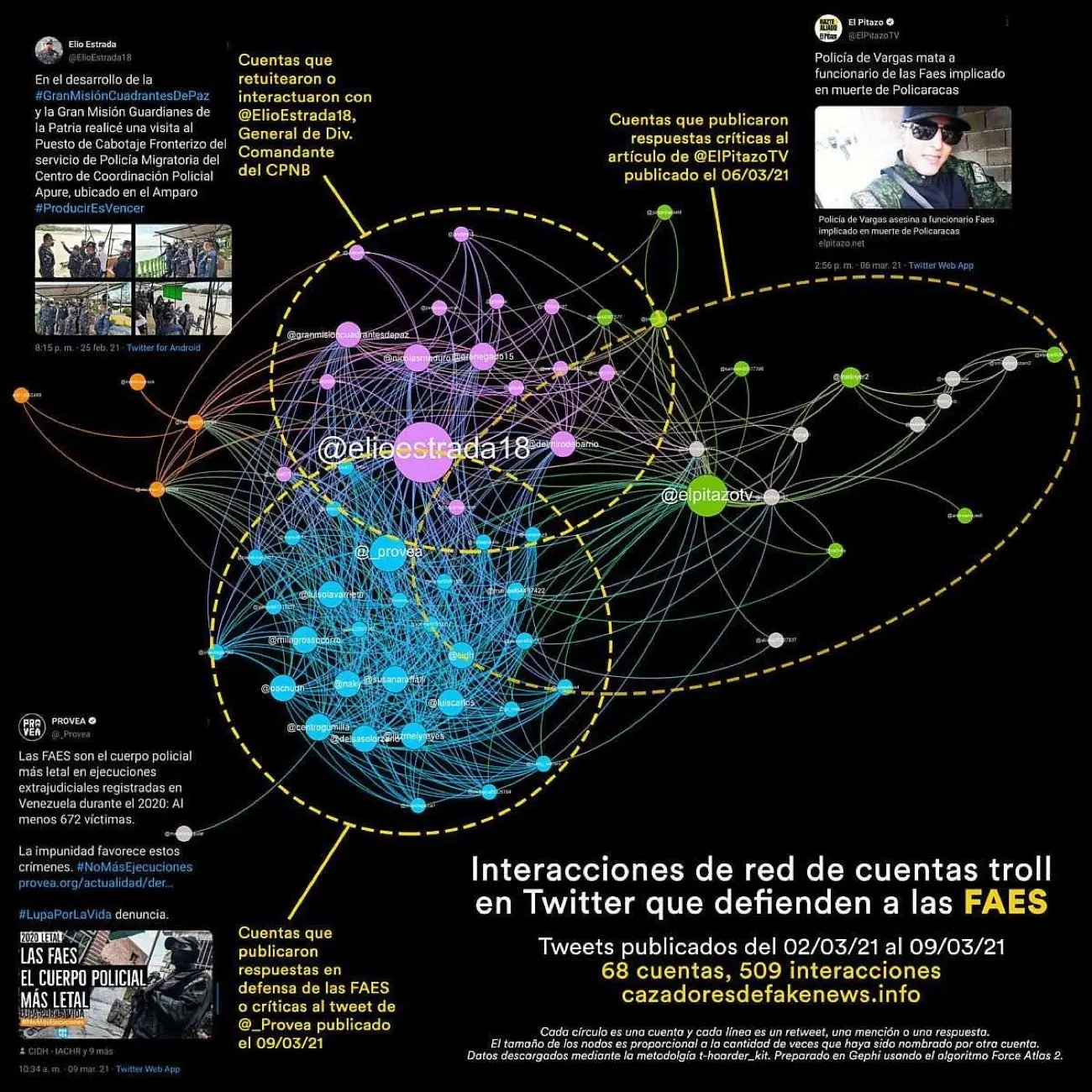 Un grupo de 85 cuentas de Twitter, publicaron múltiples respuestas de rechazo a tweets del portal venezolano El Pitazo y la Organización No Gubernamental Provea. Las respuestas estaban dirigidas a dos artículos publicados por ambas fuentes, relacionados con la actuación de las Fuerzas de Acciones Especiales (FAES), un comando de la Policía Nacional Bolivariana (PNB) de Venezuela.