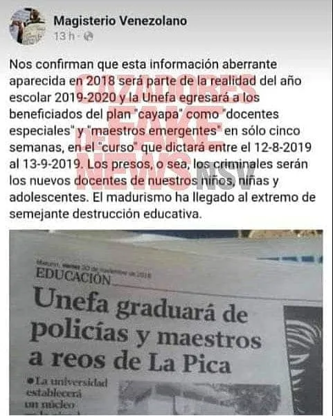 Se está difundiendo una captura de Facebook donde se denuncia que para el año escolar 2019-2020, la UNEFA egresará a reclusos como «docentes especiales» y «maestros emergentes», en un período de cinco semanas. La imagen capturada muestra también la fotografía del artículo de un periódico, con el titular: «UNEFA graduará de policías y maestros a reos de La Pica».