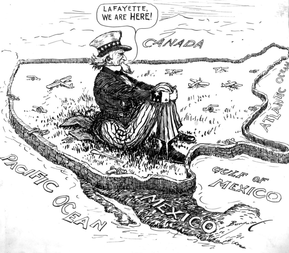 El Tío Sam en una caricatura de 1940, diciendo “Lafayette, estamos AQUÍ!” —guiño al lema con que las tropas de EE. UU. agradecieron a Francia en la I Guerra Mundial—. Lo hace desde la distancia, mientras Alemania invade Francia, Bélgica y los Países Bajos. Berryman Political Cartoon Collection, 1896–1949