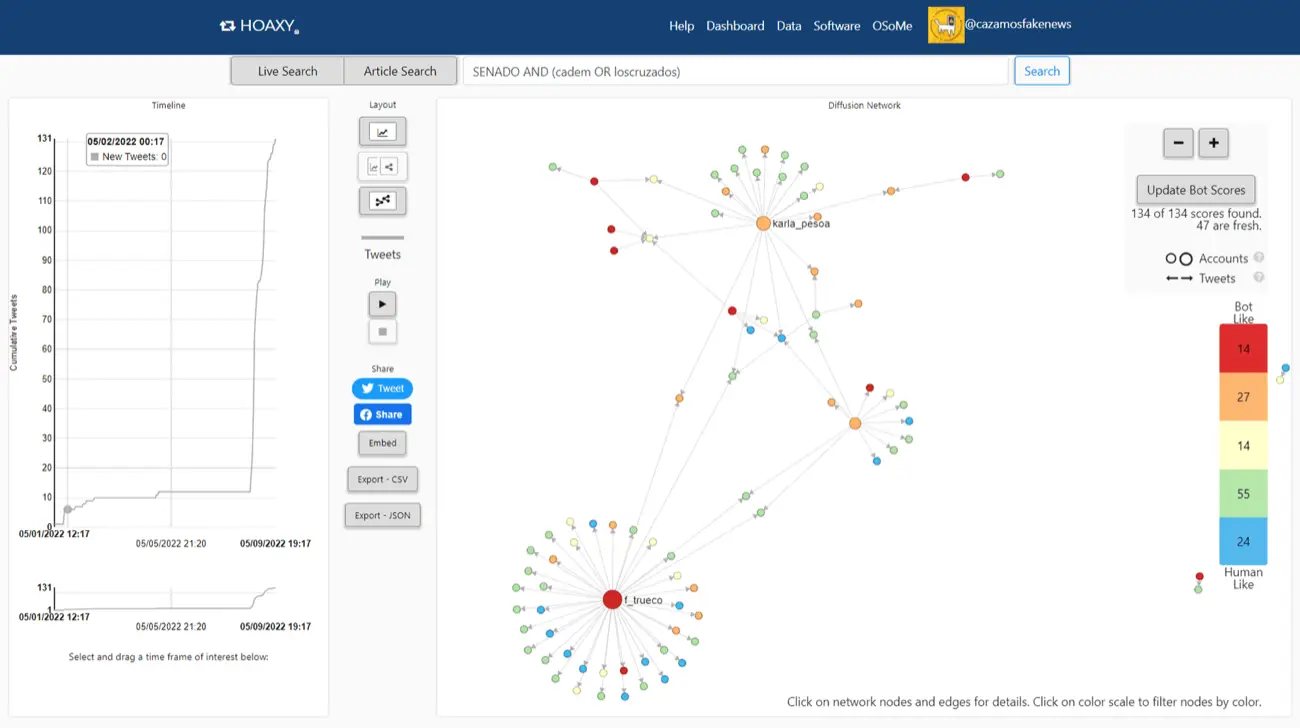 El 9 de mayo de 2022, se realizó un diagrama de interacciones en Hoaxy, usando como términos de búsqueda «SENADO» y las etiquetas #Cadem y #LosCruzados, de acuerdo a los últimos tweets publicados por 10 de las cuentas cuyas capturas de pantalla habían sido compartidas en Twitter.