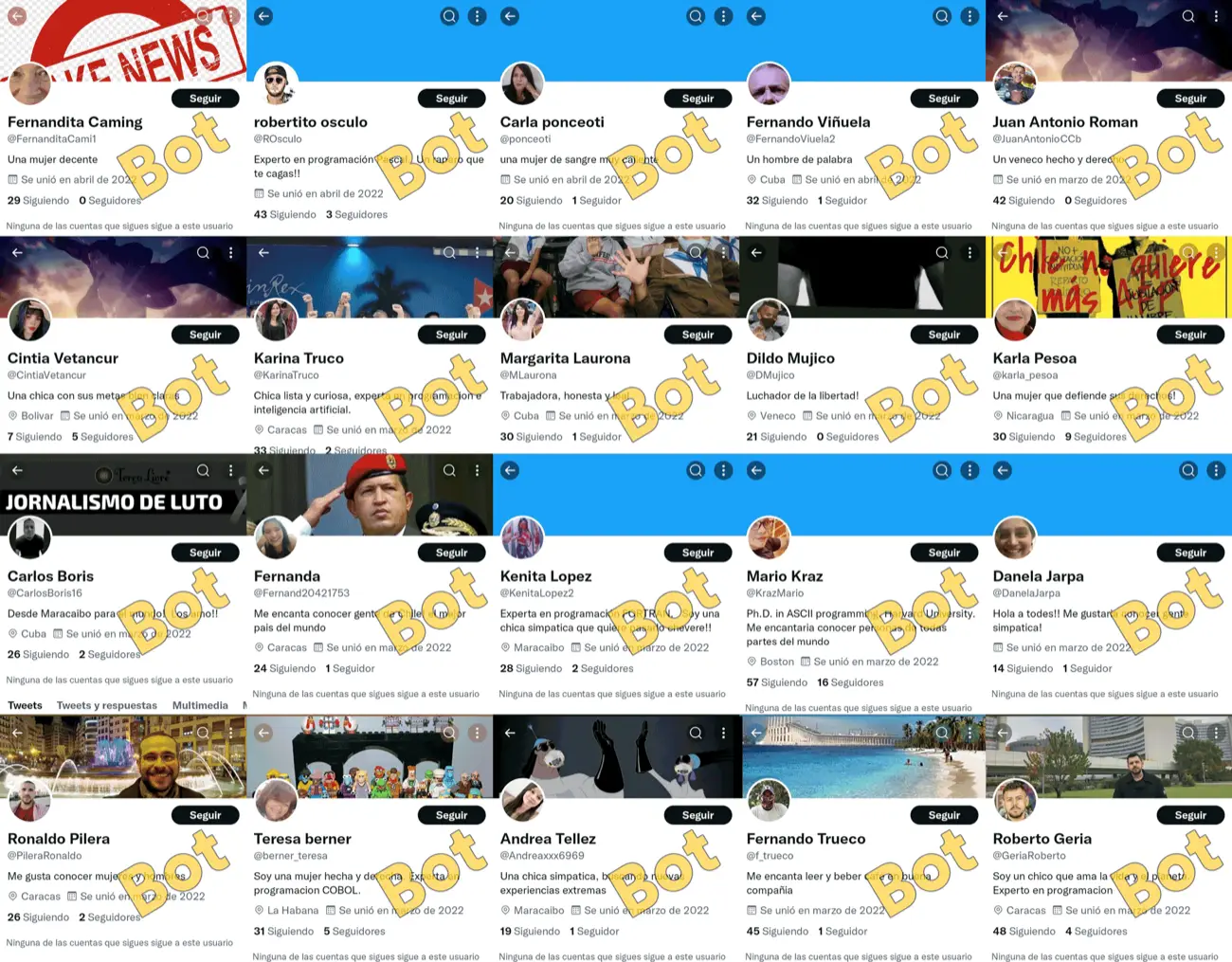 13 de las cuentas tienen como ubicación declarada a Venezuela, Cuba o Nicaragua. Se logró identificar a siete de los usuarios (reales) cuyas fotografías están siendo usadas por las cuentas falsas: