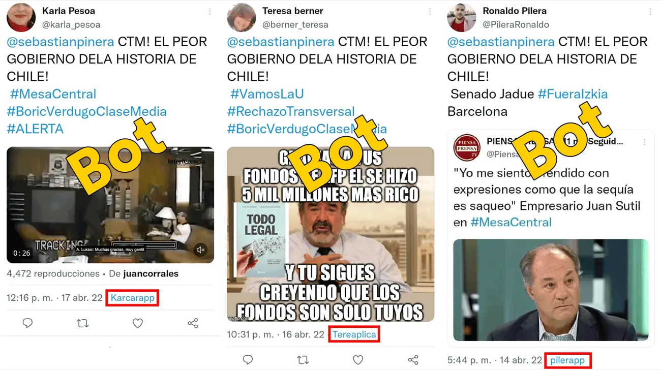 El grupo de cuentas publicó 973 tweets atacando al expresidente Sebastián Piñera, 860 tweets atacando a Checho Hirane, conductor de Radio Agricultura y 642 tweets atacando al periodista Kike Mujica.