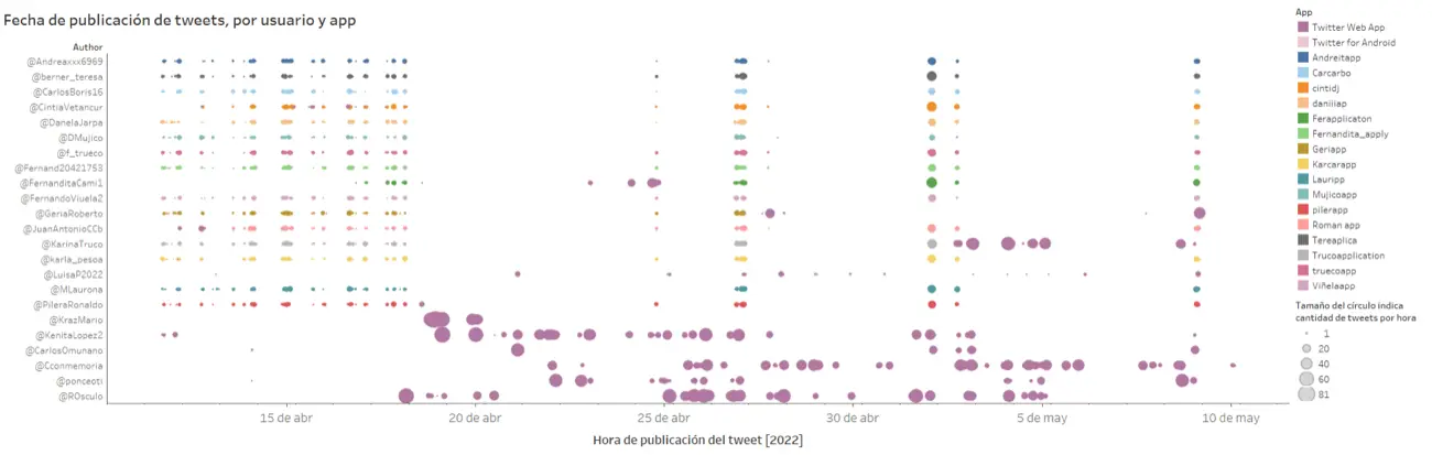 3278 de los tweets generados por la red (30,5% de los 10760 tweets originales), fueron publicados con el uso de aplicaciones externas, en horarios similares, hecho que denota automatización de las cuentas, al menos parcialmente.