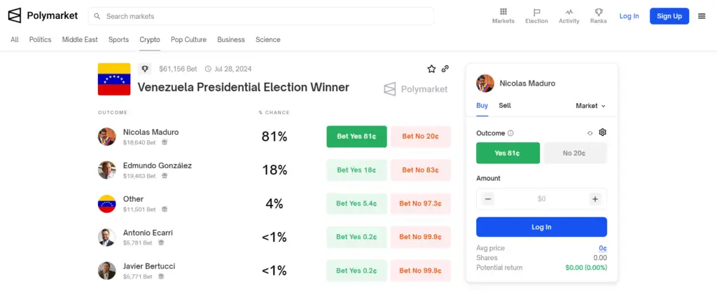 Predicciones de Polymarket que otorgan a Nicolás Maduro 82% de probabilidad de ganar las elecciones presidenciales están basadas en apuestas que no determinan el resultado definitivo de los comicios