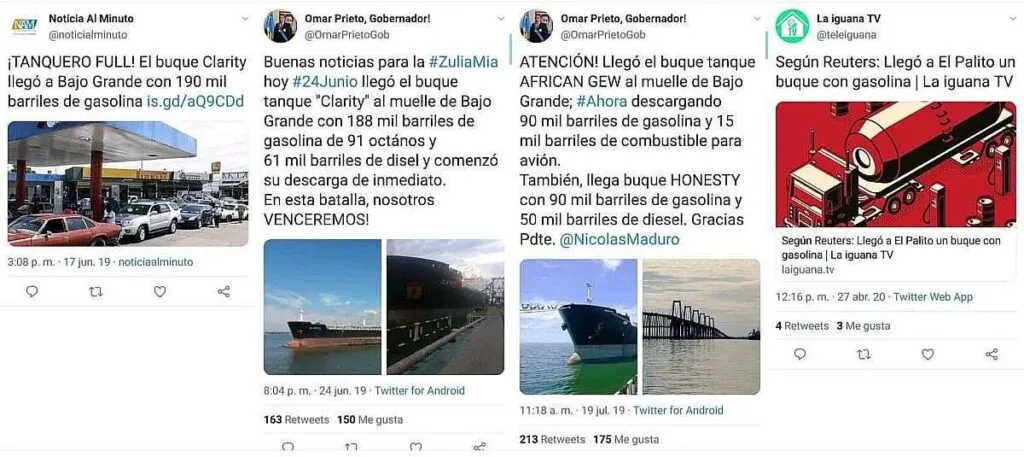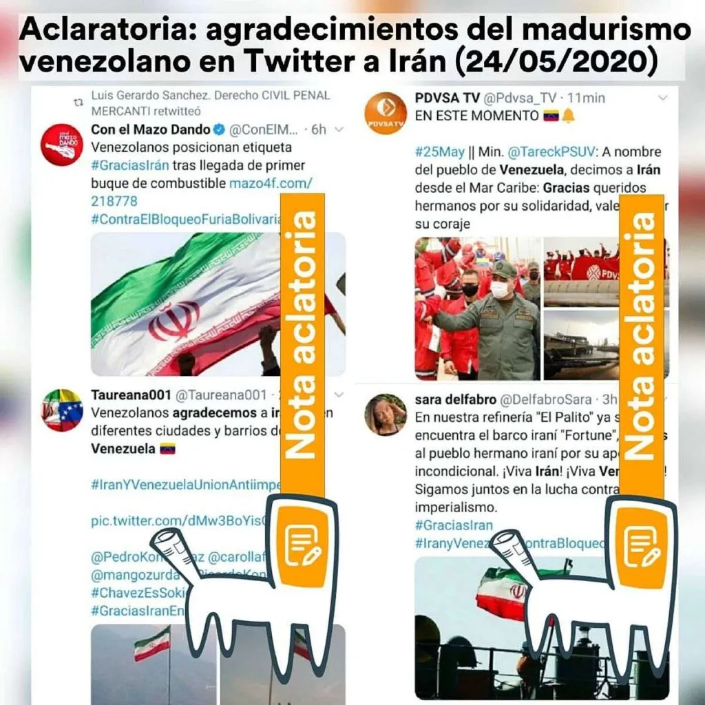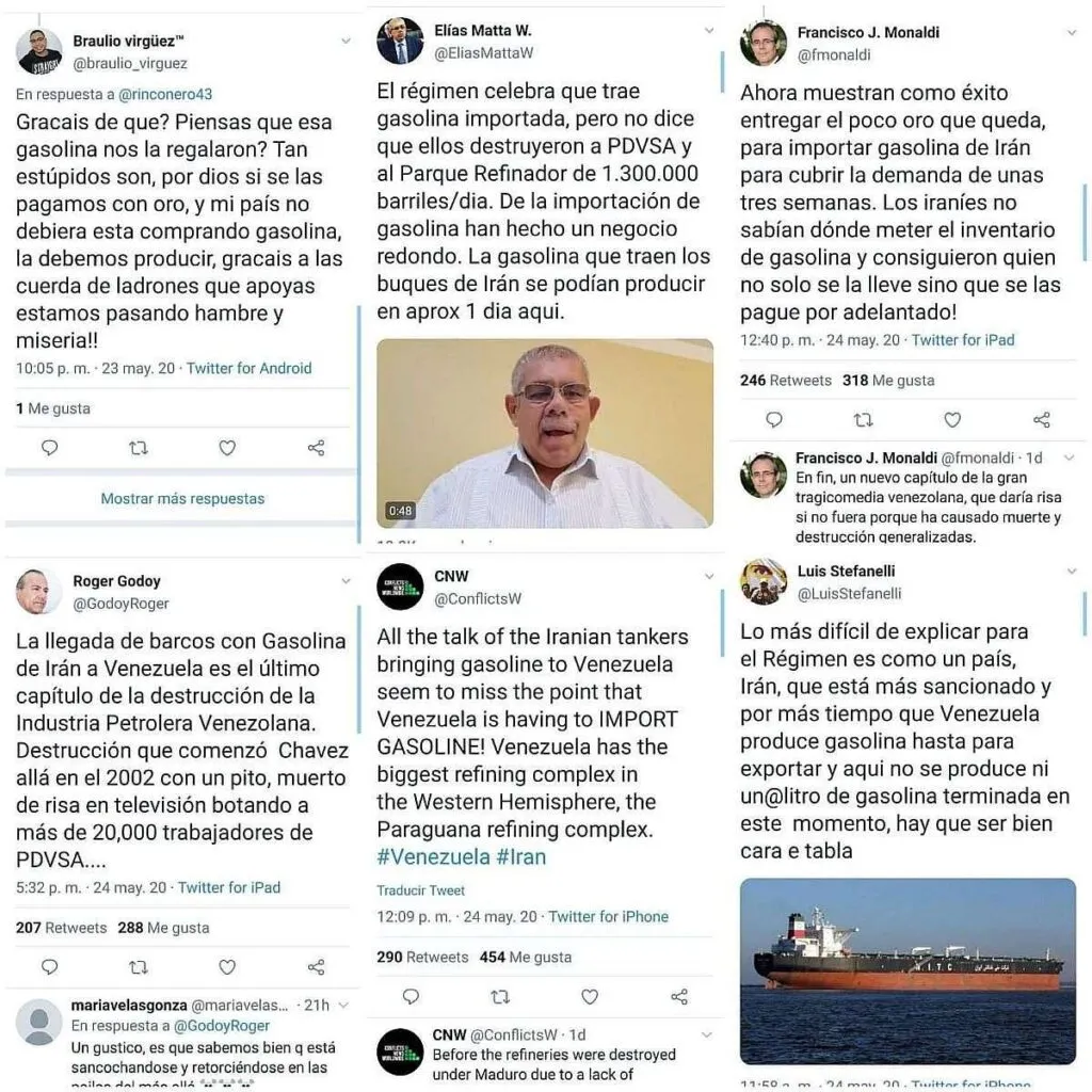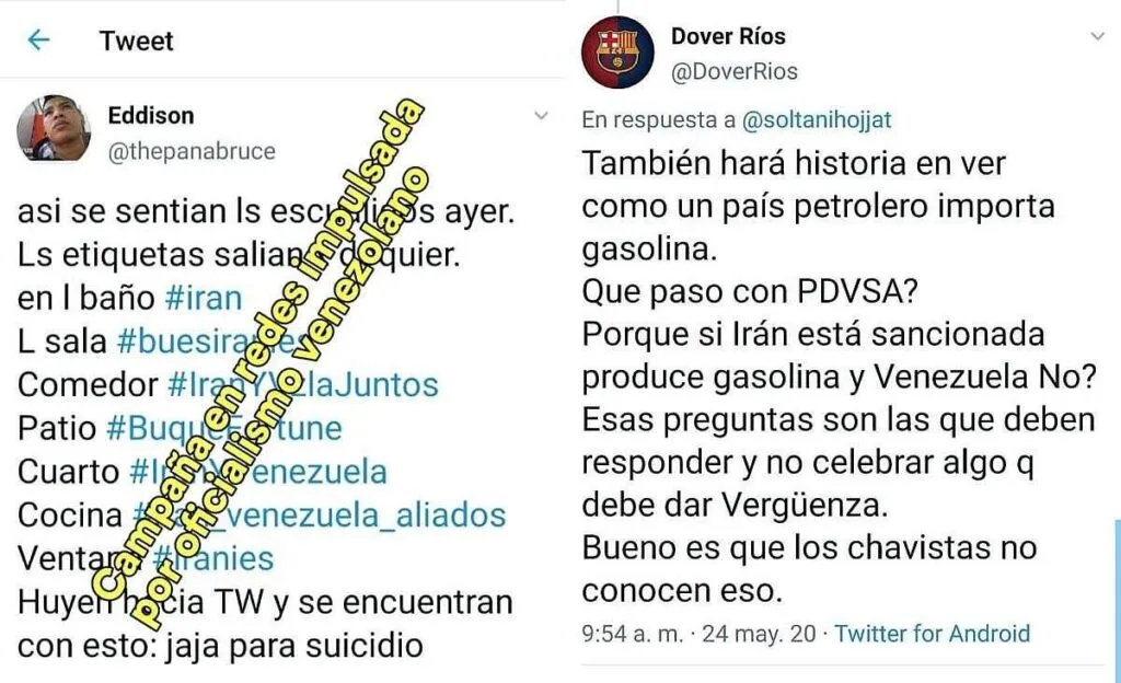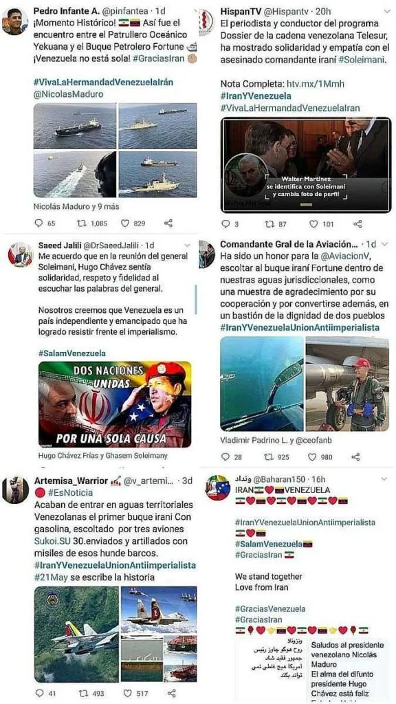 El 24 de mayo de 2020, en Twitter se compartieron varias etiquetas de agradecimiento a Irán por el envío de buques cargados de gasolina a Venezuela.