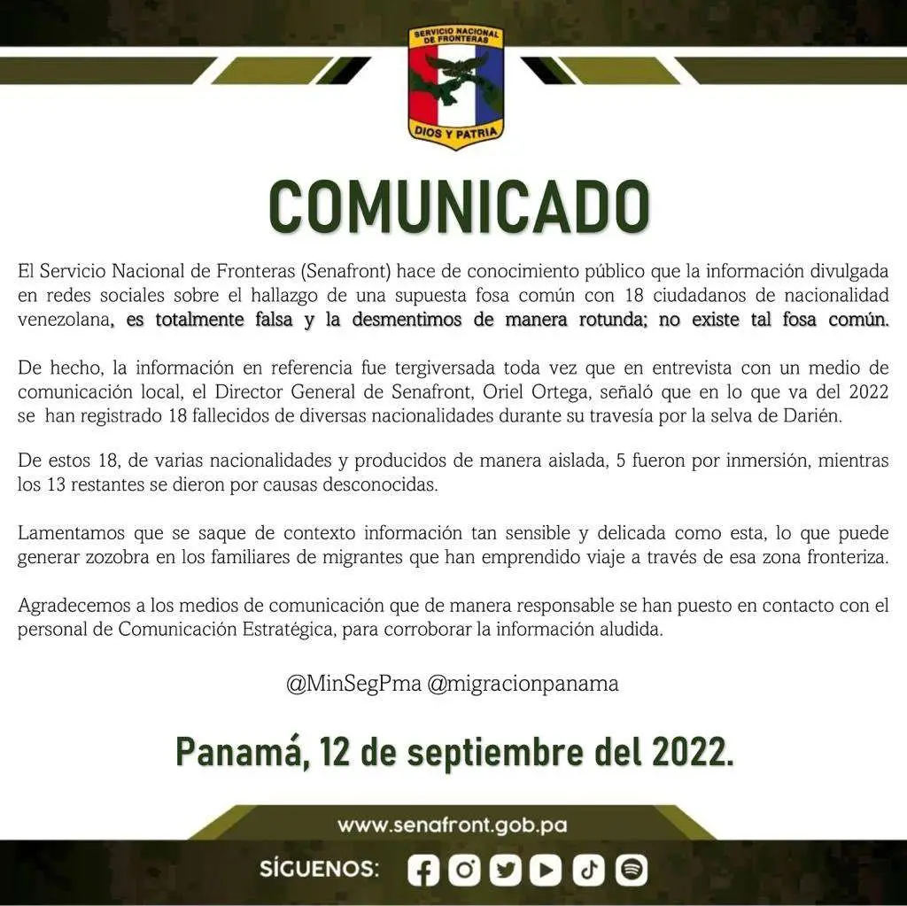 “La información en referencia fue tergiversada, toda vez que en entrevista con un medio de comunicación local, el Director General de Senafront, Oriel Ortega señaló que en lo que va del 2022 se han registrado 18 fallecidos de diversas nacionalidades durante su travesía por la selva de Darién”.