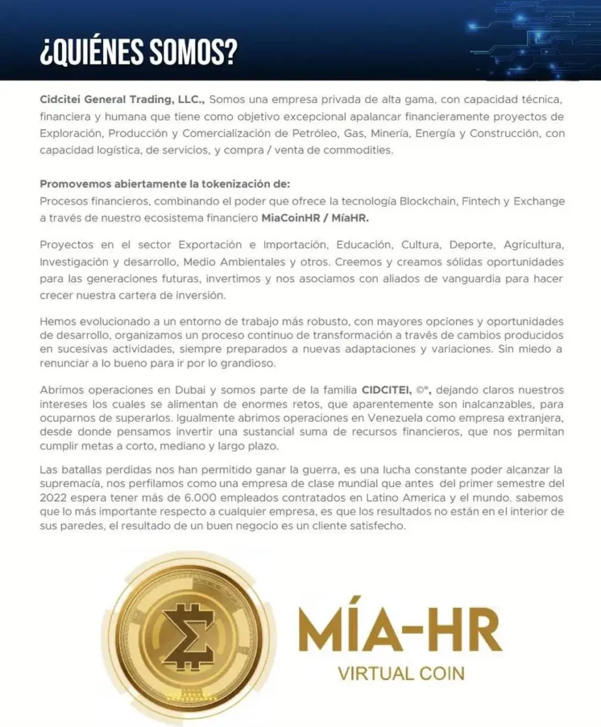 Cidcitei General Limited se presenta —en un dossier del año 2021— como una empresa con capacidad para «apalancar financieramente proyectos de Exploración, Producción y Comercialización de Petróleo, Gas, Minería, Energía y Construcción, con capacidad logística, de servicios, y compra/venta de commodities». La compañía también dice promover la tokenización de procesos financieros “combinando el poder que ofrece la tecnología Blockchain, Fintech y Exchange a través de nuestro ecosistema financiero MiaCoinHR / MíaHR”. Cidcitei describe a MiaCoinHR como el elemento central de ese ecosistema.