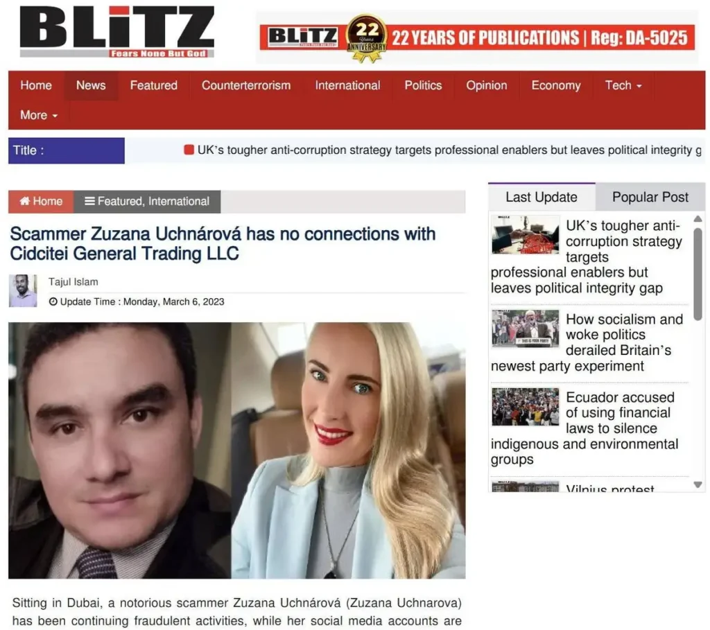 Weekly Blitz publicó varios reportajes sobre Zuzana Uchnárová, una presunta estafadora que se presentó falsamente como “Directora de Desarrollo de Negocios” de Cidcitei en Dubái. Para desmarcarse de esa relación, el propio Mauro Herrera envió un correo electrónico al portal para aclarar que Cidcitei no tenía ningún vínculo con Uchnárová, y que ella usaba el nombre de la compañía sin autorización.