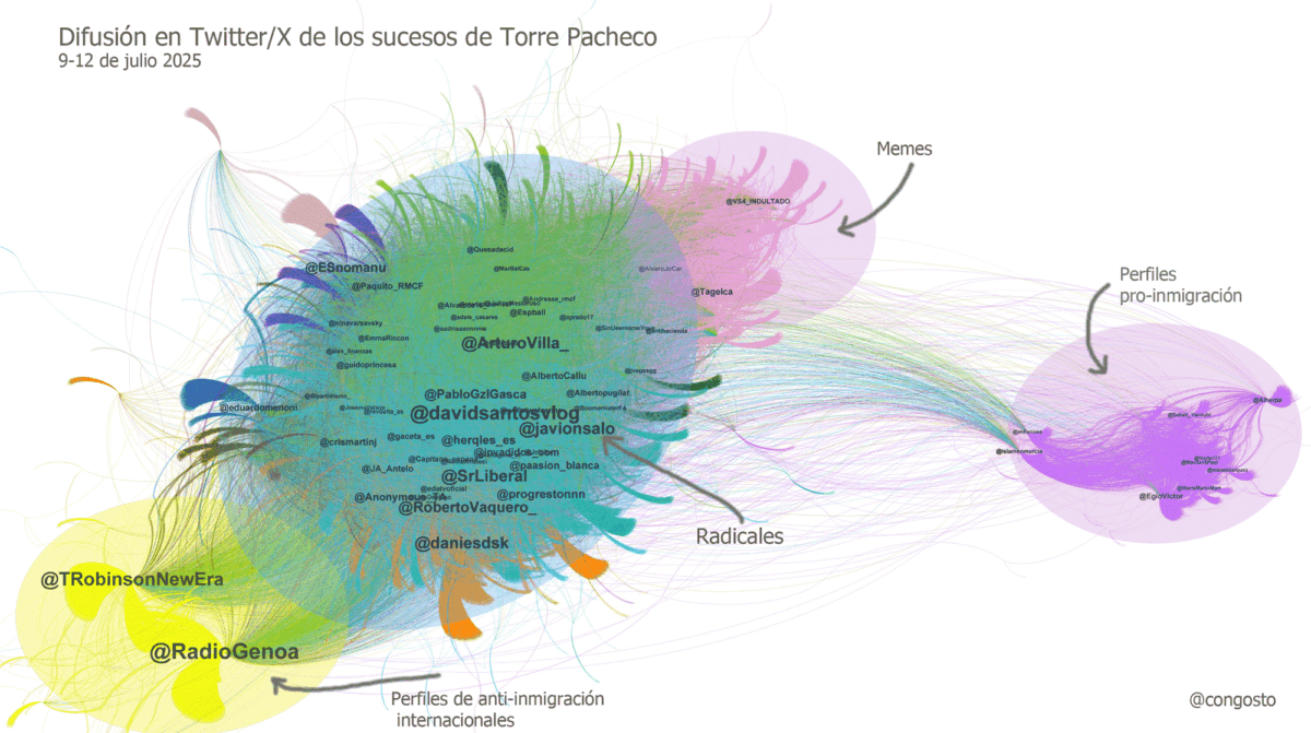 Existen formas de hacer este tipo de estudios con transparencia metodológica. La investigadora digital española Mariluz Congosto, en un análisis sobre la agitación digital previa a los sucesos de julio de 2025 en Torre Pacheco, Murcia, fijó cronología concreta, explicó fuentes de datos, reconoció limitaciones y reportó comunidades de usuarios que identificó, incluyendo sus proporciones.