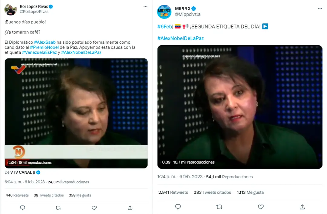 Desde la cuenta de Twitter del Ministerio para la Comunicación y la Información de Venezuela (MIPPCI), el 06 de febrero se dictó una orden para las tropas chavistas que hacen vida en esta red social de amplificar, la etiqueta #AlexNobelDeLaPaz, logrando posicionar de forma inorgánica el tema y dándole relevancia en la conversación digital.