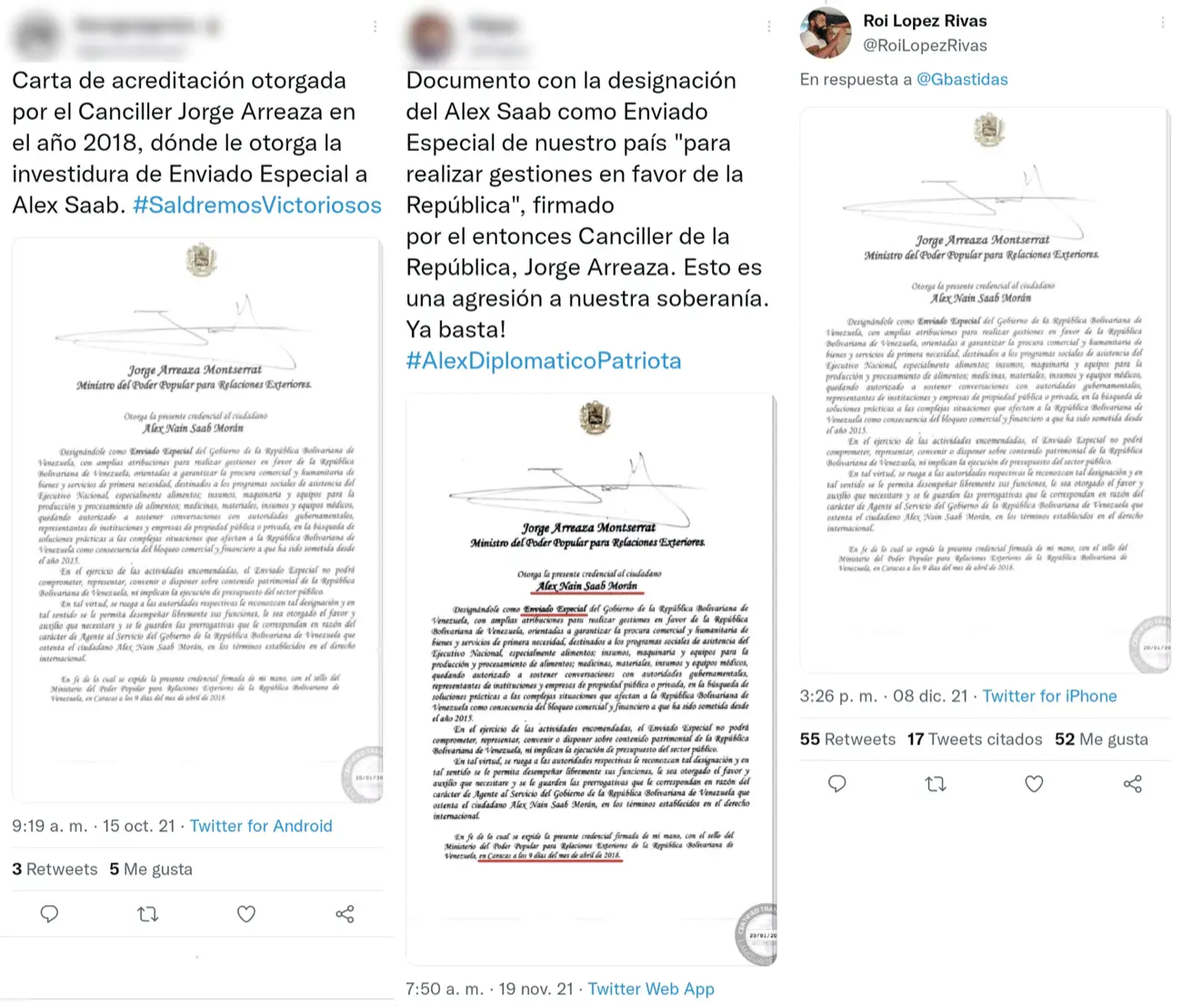 Si bien desde junio de 2020 se hablaba diplomáticamente de Alex Saab como «Enviado Especial«, la existencia de una credencial que avalara su título era desconocida. Roberto Deniz, periodista de Armando.Info, compartió por primera vez la credencial en Twitter, el 22 de enero de 2021: