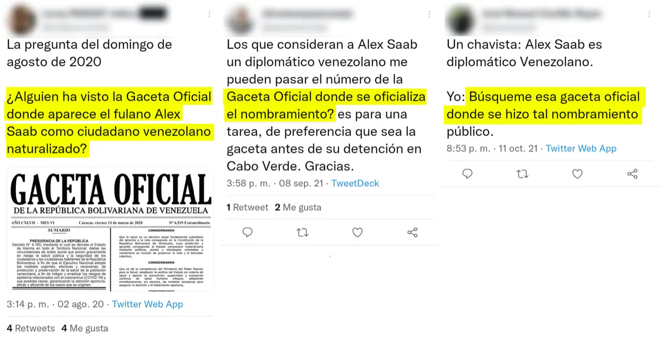 Twitter conserva decenas de mensajes de usuarios dudando sobre la veracidad de la supuesta credencial y que pidieron reiteradamente, al menos desde agosto de 2020, el número y fecha de la Gaceta Oficial “misteriosa” en la que se debió hacer el nombramiento oficial de Alex Saab como “Enviado Especial”: