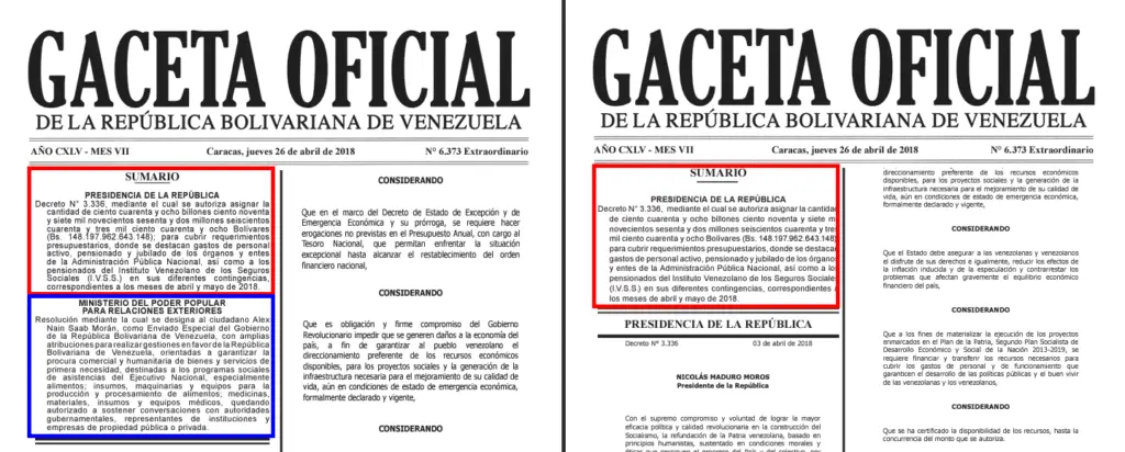 En dicho documento se indica que la credencial de Saab había sido (supuestamente) oficializada no el 9 de abril, ni el día siguiente, sino más de dos semanas después de la supuesta designación, el jueves 26 de abril de 2018, en la Gaceta Oficial N° 6.373 Extraordinario.