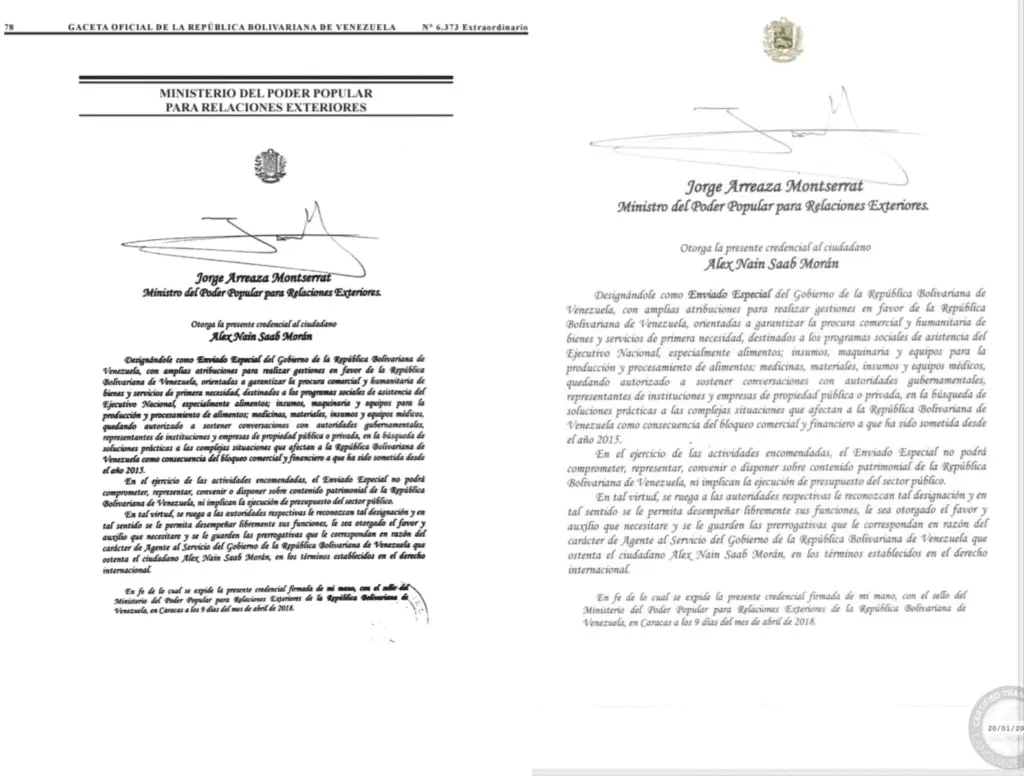 Entre estos documentos, figuran varios pasaportes de Saab y una credencial de «Enviado Especial del Gobierno de la República Bolivariana de Venezuela”, que lleva como fecha el 9 de abril de 2018 y la firma del para entonces Canciller de Venezuela, Jorge Arreaza. Dicha credencial es la base de uno de los principales argumentos que ha presentado la defensa de Alex Saab para su liberación.