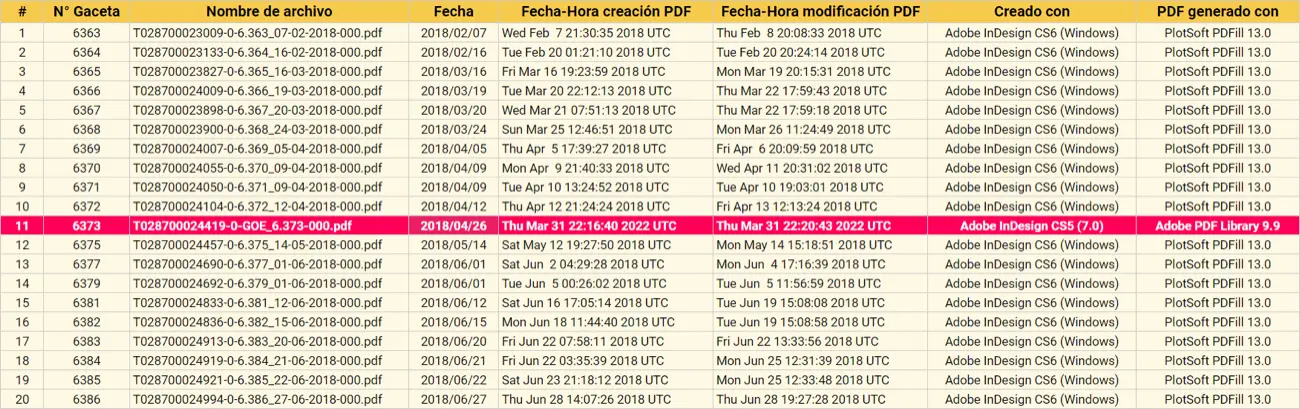 Los metadatos del archivo PDF de la versión de 80 páginas de la Gaceta N° 6.373 indican que fue creado el 31 de marzo de de 2022, a las 6:16 H (VEN), casi 47 meses después de la fecha de su supuesta publicación, el 26 de abril de 2018