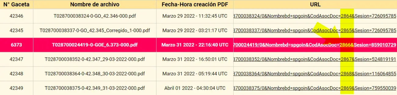 En la imagen de abajo, se indica en color amarillo el número consecutivo de los archivos que fueron subidos a imprentanacionalgob.ve y la Gaceta N° 6.373 tiene un consecutivo (2866) que demuestra que fue subida entre la Gaceta N° 42.345 (consecutivo 2865) y la N° 42.347 (consecutivo 2867).