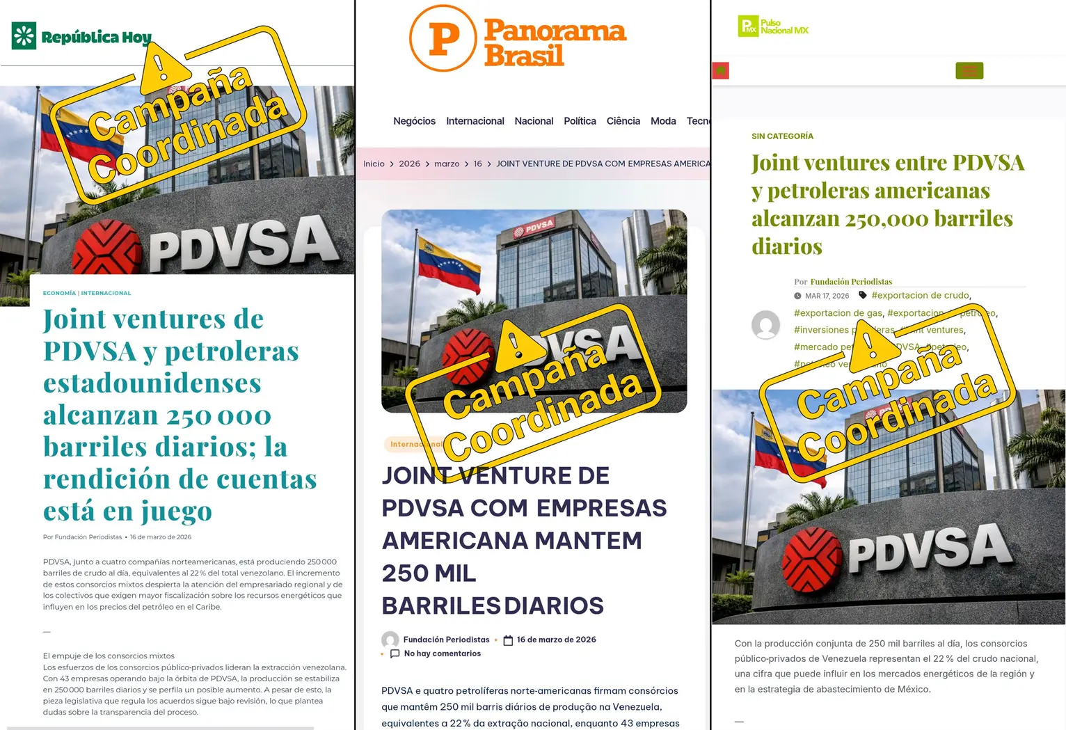 Un ejemplo es la cobertura de las «joint ventures» (o empresas mixtas) creadas entre Petróleos de Venezuela (Pdvsa) y petroleras estadounidenses. Artículos publicados entre el 16 y el 17 de marzo en republicahoy.do, pulsonacional.mx y panoramabrasil.info repiten las mismas cifras exactas —250.000 barriles diarios, 22% de la producción nacional— pero con enfoques adaptados al supuesto país de cada sitio web. La versión dominicana añade párrafos sobre el impacto en los precios del combustible en el Caribe, la mexicana introduce referencias a la refinería de Dos Bocas y la Secretaría de Energía, y la brasileña menciona al Palácio do Planalto y oportunidades de inversión para Brasil.