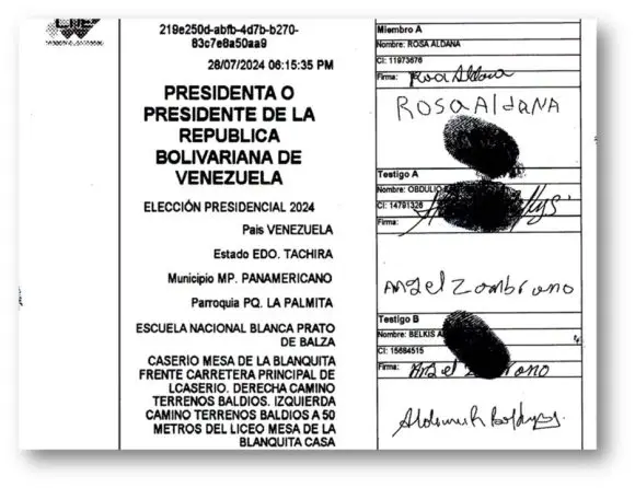 Otro de los argumentos en contra de la autenticidad de las actas emitidas por las máquinas electorales es que “en muchas de ellas no aparecen las firmas de los testigos de las diferentes formaciones políticas, (recordemos que la oposición llevaba semanas denunciando un posible fraude) ni tampoco las de los operadores de las máquinas usadas en el proceso”.