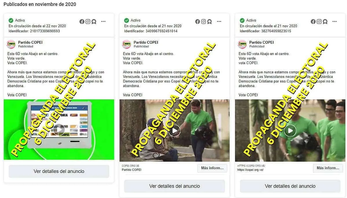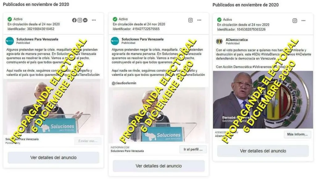 Ninguno de los anteriores anuncios fue declarado como propaganda electoral en el Facebook Ad Library, impidiendo a los posibles votantes venezolanos conocer con transparencia de qué forma se disponen los recursos destinados a la campaña de las elecciones del 6 de diciembre en Venezuela.