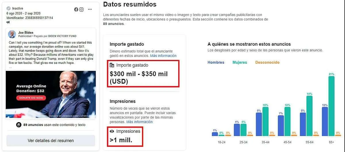 El pago de anuncios de este tipo en redes sociales, implica que su mensaje tendrá una difusión considerable en grupos específicos, con una cantidad de impresiones indeterminada, debido a que, como no fueron declarados como anuncios con contenido electoral, sus estadísticas no son visibles de forma abierta.