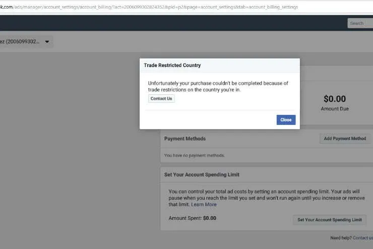 En Venezuela, Facebook restringe la contratación directa de anuncios («ads«) de Facebook e Instagram. Usuarios han manifestado la imposibilidad de contratar anuncios, al menos dentro del país y usando moneda local como medio de pago. En varios artículos publicados desde el año 2019, community managers y comerciantes confirmaron estas dificultades, provocando la intervención de terceros, que contratan los servicios desde el exterior y usando moneda extranjera.