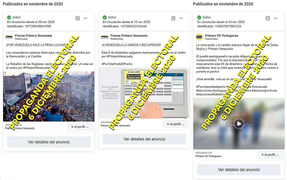 Primero Venezuela, el partido creado por antiguos integrantes de Primero Justicia, lleva al menos 5 anuncios puoblicados en Instagram: dos publicados por la cuenta Prensa Primero Venezuela (desde el 15 de noviembre), dos publicados por la cuenta Primero Venezuela Monagas (desde el 28 de noviembre) y uno publicado por la cuenta Primero VE Portuguesa el 24 de noviembre: