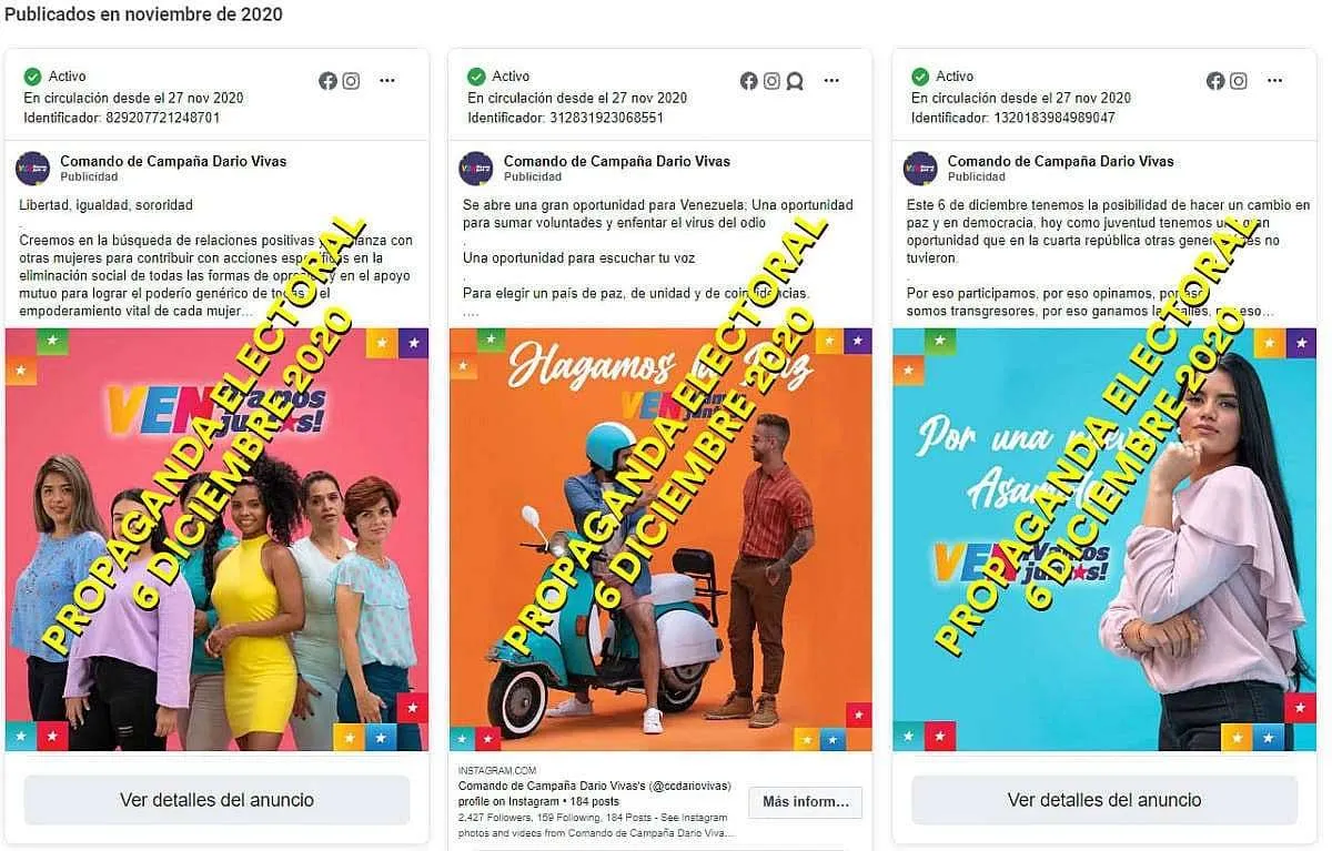 El Comando de Campaña Darío Vivas (candidatos del PSUV) ya publicó 7 anuncios electorales en Facebook e Instagram, todos desde el 26 de noviembre. Ninguno aparece como anuncio electoral: