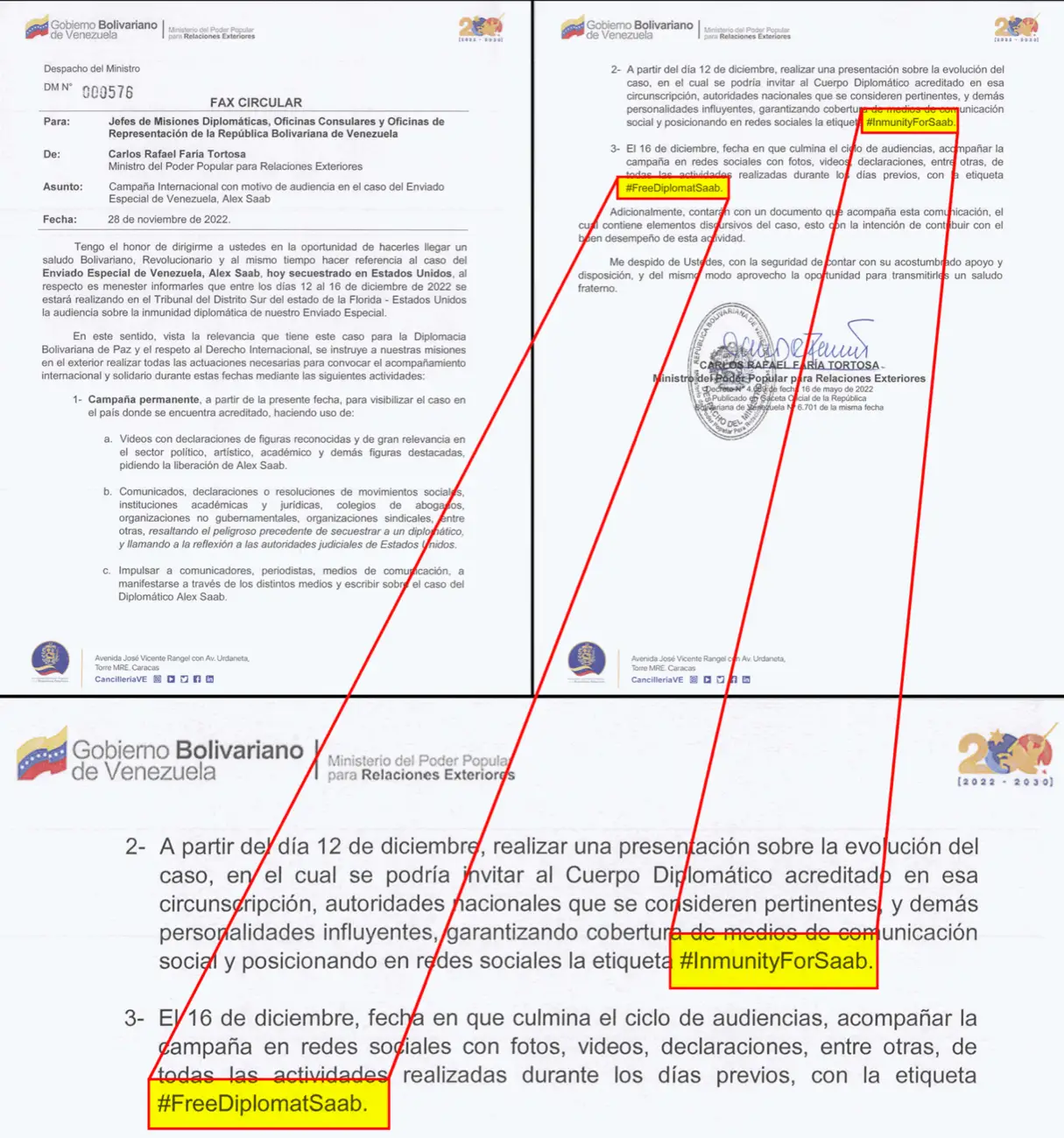El canciller venezolano Carlos Faría, instruyó a través de una circular firmada el 28 de noviembre de 2022 el inicio de la “campaña permanente” con el objetivo de hacer visible en Estados Unidos la narrativa de la “inmunidad diplomática” de Saab y presionar a la opinión pública para favorecer al empresario colombiano en el juicio. La circular fue enviada a los jefes de Misiones Diplomáticas, oficinas consulares y oficinas de representación de Venezuela alrededor del mundo: