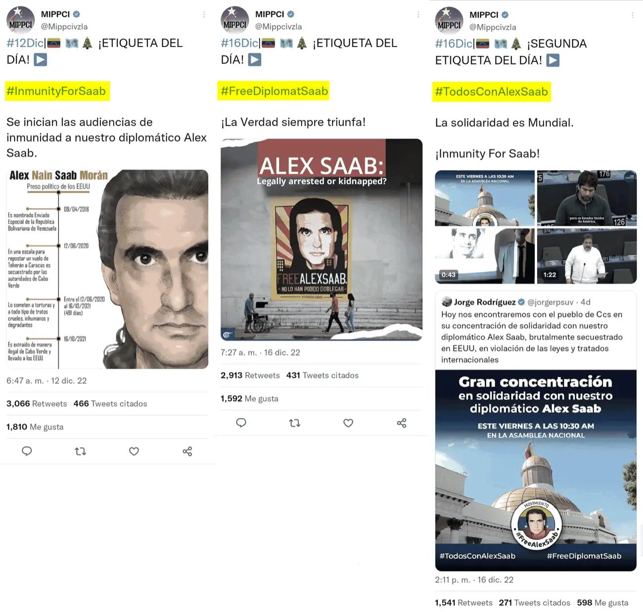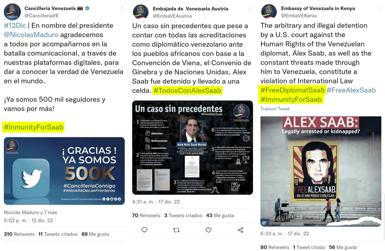 En el documento firmado se indicó a los representantes diplomáticos de Venezuela alrededor del mundo que participaran en el posicionamiento de dos campañas de tendencias en Twitter a favor de Alex Saab: una con el uso de la etiqueta #InmunityForSaab (“Inmunidad para Saab”, con un error ortográfico —la palabra en inglés es “immunity”—) debía ser impulsada el 12 de diciembre de 2022 y la segunda, con la etiqueta #FreeDiplomatSaab (“Liberen al diplomático Saab”) el 18 de diciembre.