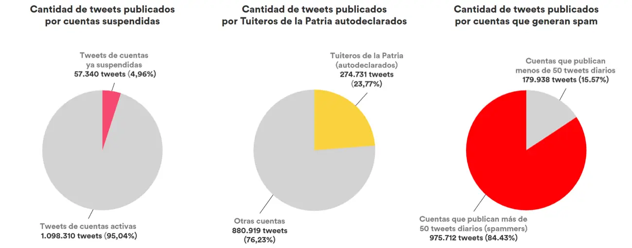 - Al 23 de diciembre de 2022, Twitter suspendió al menos 159 cuentas participantes en la promoción de las tres etiquetas y que publicaron, en conjunto, 57.340 tweets, principalmente tweets con spam. De forma referencial se puede indicar que, en Venezuela, la mayoría de las etiquetas de protesta impulsadas de forma espontánea no superan los 10.000 tweets.