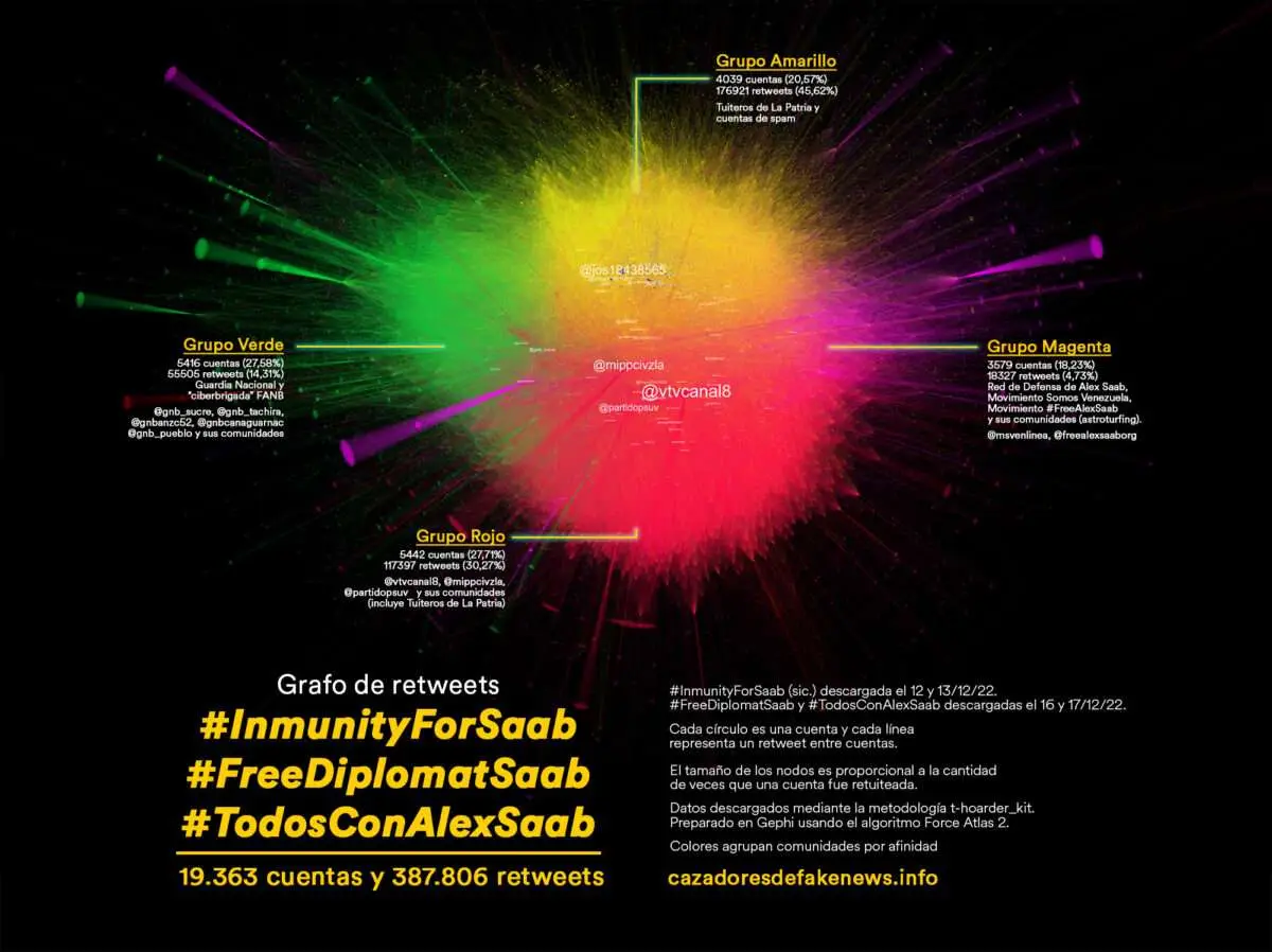 El 12 de diciembre, tal como se esperaba, comenzó a impulsarse la etiqueta #InmunityForSaab en Twitter. No hubo lugar para dudas de la relación entre el hashtag y la instrucción del Canciller venezolano plasmada en la circular del 28 de noviembre: la etiqueta llevaba el mismo error ortográfico en la palabra “immunity”, que fue repetido al menos 284.500 tweets publicados entre el 12 y el 13 de diciembre: