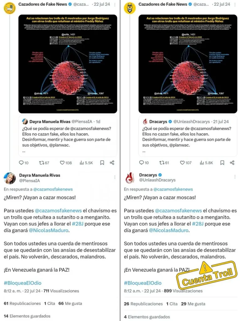 El 19 de julio de 2024, Jorge Rodríguez —presidente de la Asamblea Nacional, jefe de campaña de Nicolás Maduro y exministro de Comunicación— presentó en rueda de prensa varias capturas de mensajes de odio publicados en X, atribuyéndolos a supuestos opositores. Posteriormente se demostró que provenían de una operación de desinformación de falsa bandera, ejecutada por una red de cuentas trolls que estaba vinculada con la campaña de Maduro.