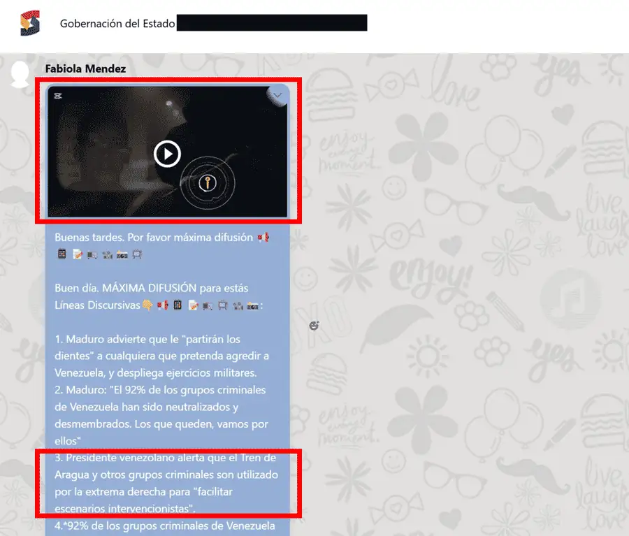 El 23 de enero de 2025, en los grupos se envió una serie de “líneas discursivas”, basadas en un discurso de Nicolás Maduro sobre la lucha contra el Tren de Aragua y otros grupos criminales, y su supuesta vinculación con la “extrema derecha” venezolana. El texto iba acompañado con una nota de voz atribuida al líder criminal Wilexis Acevedo, en el que lanzaba amenazas contra varios funcionarios del gobierno venezolano, que ya había sido compartido el día anterior a través del canal de Telegram del ministro Ñáñez.
