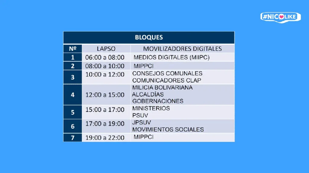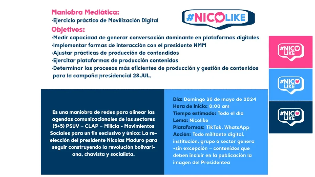 Una de las campañas coordinadas a través del Siscom fue #NicoLike, impulsada el 26 de mayo de 2024. A través del sistema, se distribuyeron instrucciones específicas, en formato pdf, incluyendo cronograma dividido por franjas horarias para publicar los contenidos, junto a la etiqueta, en redes sociales. A las 6:00 a. m. comenzaba el Mippci; luego seguían consejos comunales, Comunicadores CLAP, Milicia Bolivariana, alcaldías, gobernaciones y ministerios.