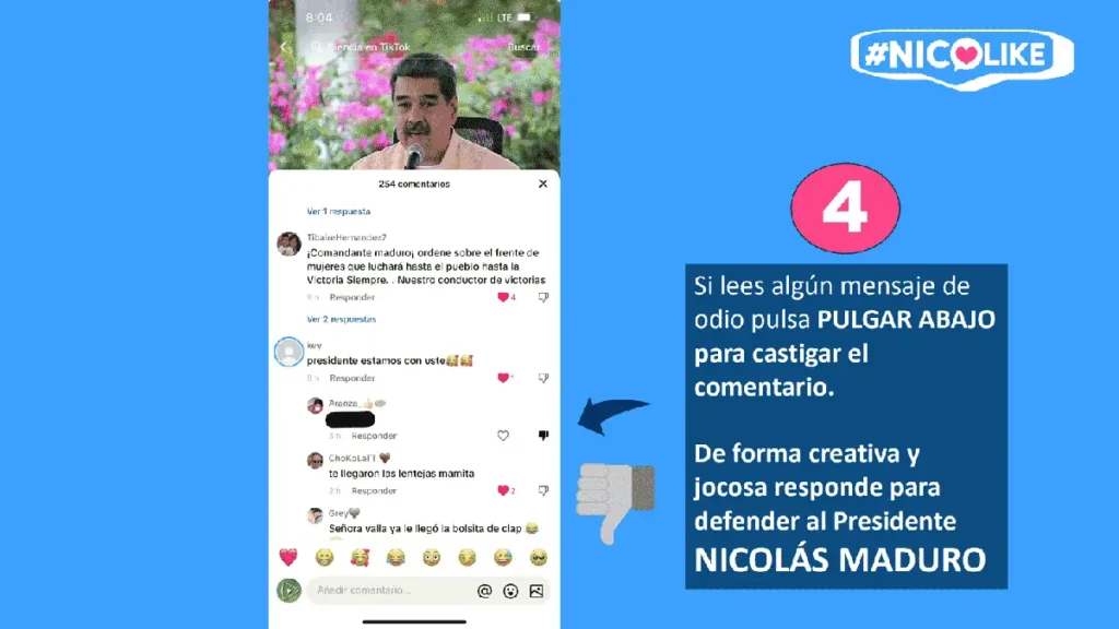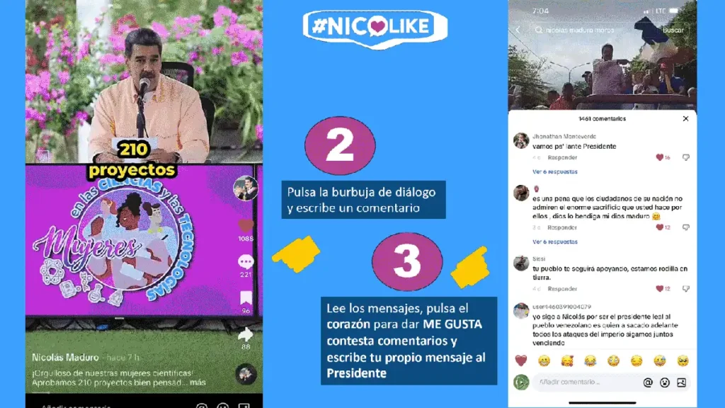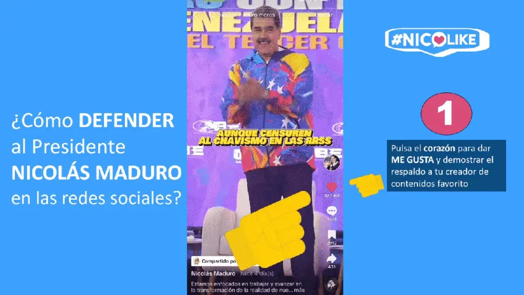 El 2 de junio de 2024, el viceministro Johannyl Rodríguez indicó paso a paso cómo interactuar con publicaciones del presidente Nicolás Maduro en Instagram: “le doy like, le hago comentario, le doy like al comentario positivo con más likes para que marque el ritmo de la conversación en los comentarios, comparto en otras redes sociales, guardo y descargo el post que tenga el presidente en el momento”.
