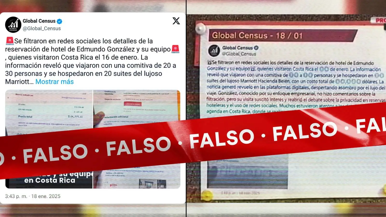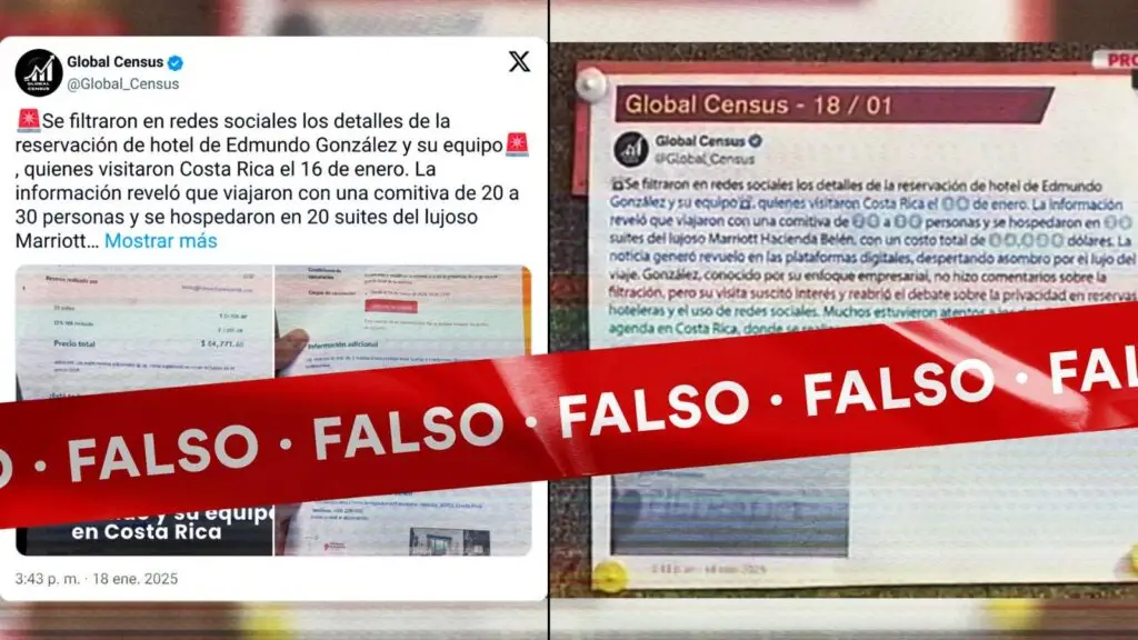 En la edición #512 de «Con El Mazo Dando», emitida el 22 de enero de 2025, Diosdado Cabello citó un bulo publicado inicialmente por la cuenta de X de una falsa encuestadora, Global Census, sobre una falsa reservación de hotel por más de 60.000 dólares atribuida a Edmundo González y su comitiva, relacionada con su estadía en Costa Rica. La imagen fue difundida desde el 18 de enero por varias cuentas de X, y amplificada también por los falsos noticieros de Instagram que forman parte de la red «La Fábrica de Desinformación». Es una prueba más de la existencia de esfuerzos de amplificación multiplataforma y de la existencia de una operación de influencia que se ha activado en muchas otras ocasiones para promover campañas desinformativas.