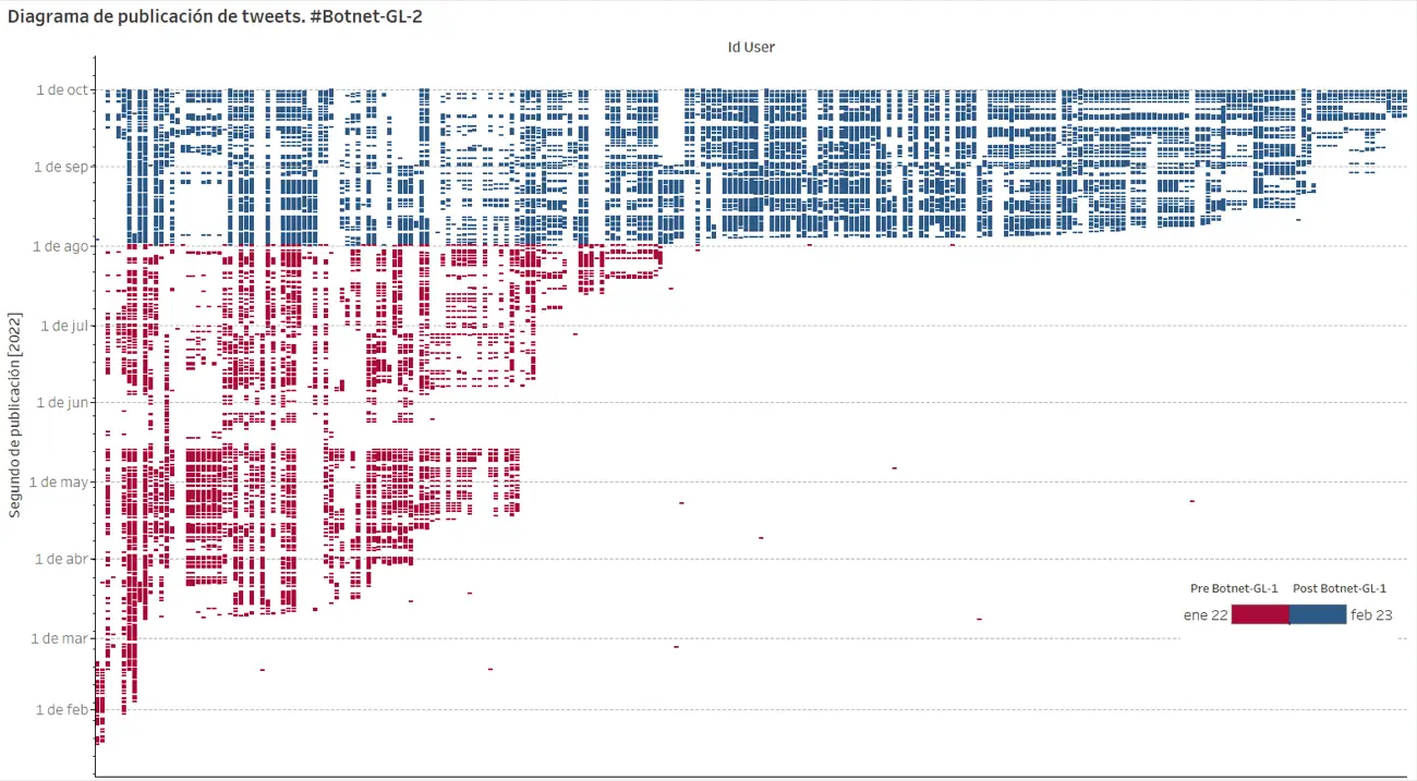 En el siguiente diagrama, se muestran en color rojo tweets publicados antes del 2 de agosto de 2022, día en el que se realizó la denuncia contra la #Botnet-GL-1. A partir de ese día fueron creadas 222 nuevas cuentas que forman parte de la #Botnet-GL-2 (líneas verticales que no tienen tweets marcados en rojo):